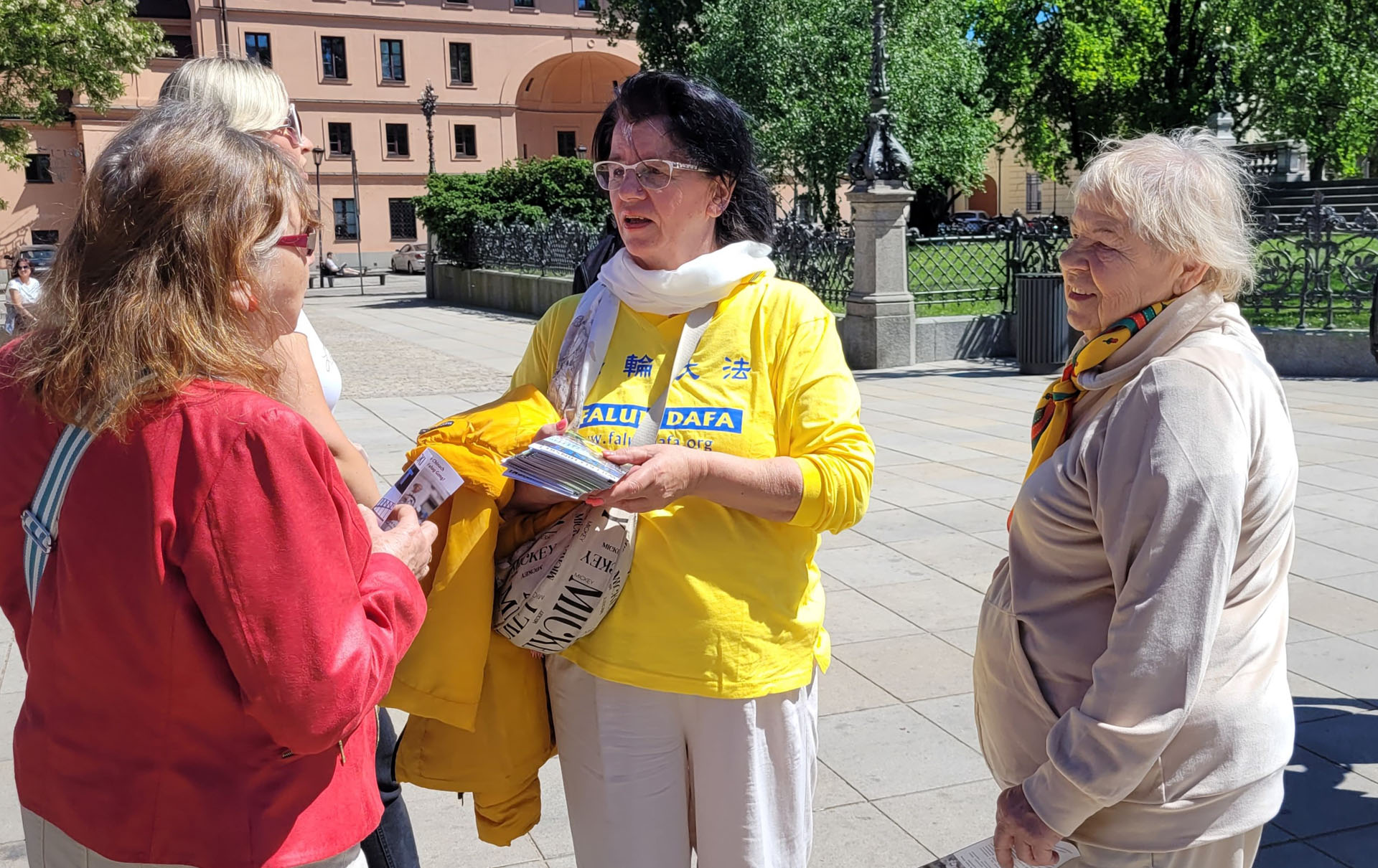 Praktikantica im je objasnila da se Falun Dafa prakticira u preko 100 zemalja i da praktikanti čitaju glavna učenja u knjizi Zhuan Falun koja su dostupna na mnogim jezicima. Osim što im je govorila o dobrobitima koje je dobila od same Falun Dafa, praktikantica im je također razjasnila i zablude uzrokovane klevetničkom propagandom Komunističke partije Kine (KPK). Dvije djevojke su klimnule s razumijevanjem, zahvalile joj se i rekle da će pročitati više o praksi.