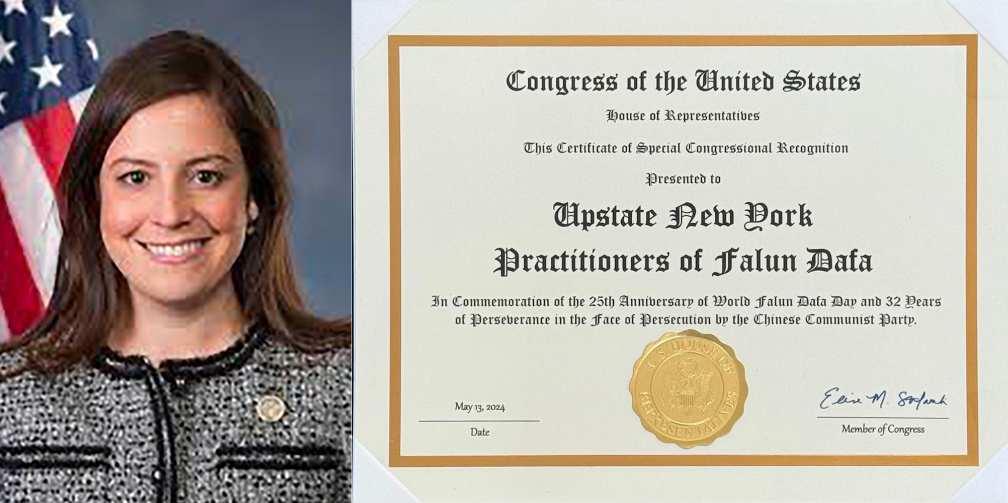 Kongresmenka Elise Stefanik, predsedavajuća republikanskog poslaničkog kluba Predstavničkog doma, i kongresmen Hakeem Džefris, lider manjine u Predstavničkom domu i vođa demokratskog poslaničkog kluba Predstavničkog doma, oboje iz Njujorka, poslali su potvrde o specijalnom priznanju Kongresa, odnosno pismo u čast Svetskom danu Falun Dafe.