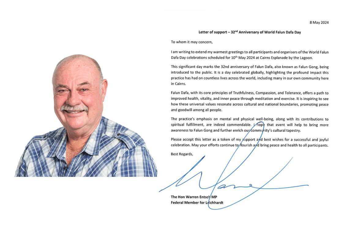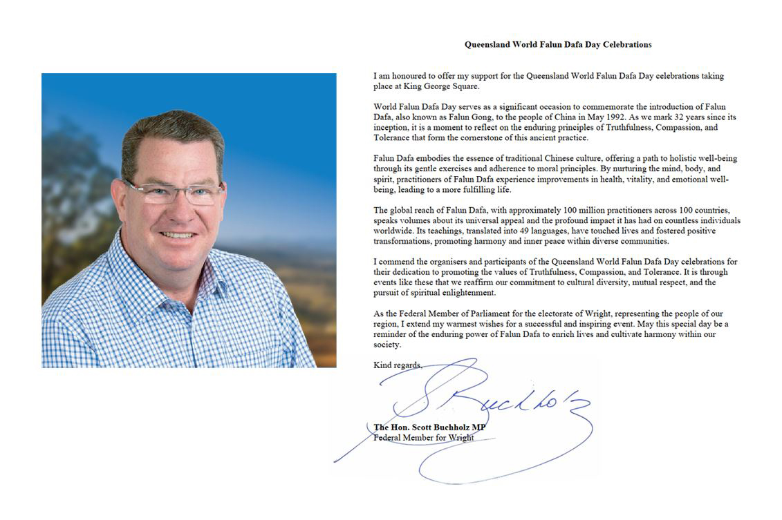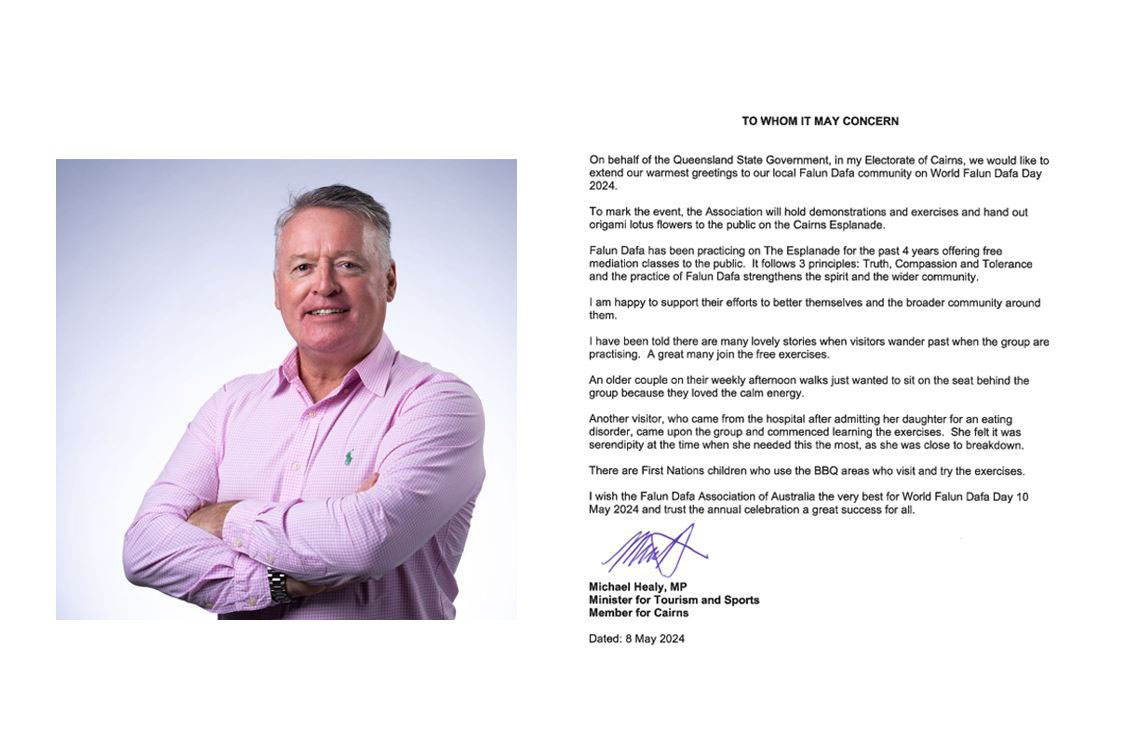 “Želimo ukazati podršku Falun Dafa udruženju Australije i divnim prednostima koje su donesene tolikom broju ljudi u Queenslandu.”