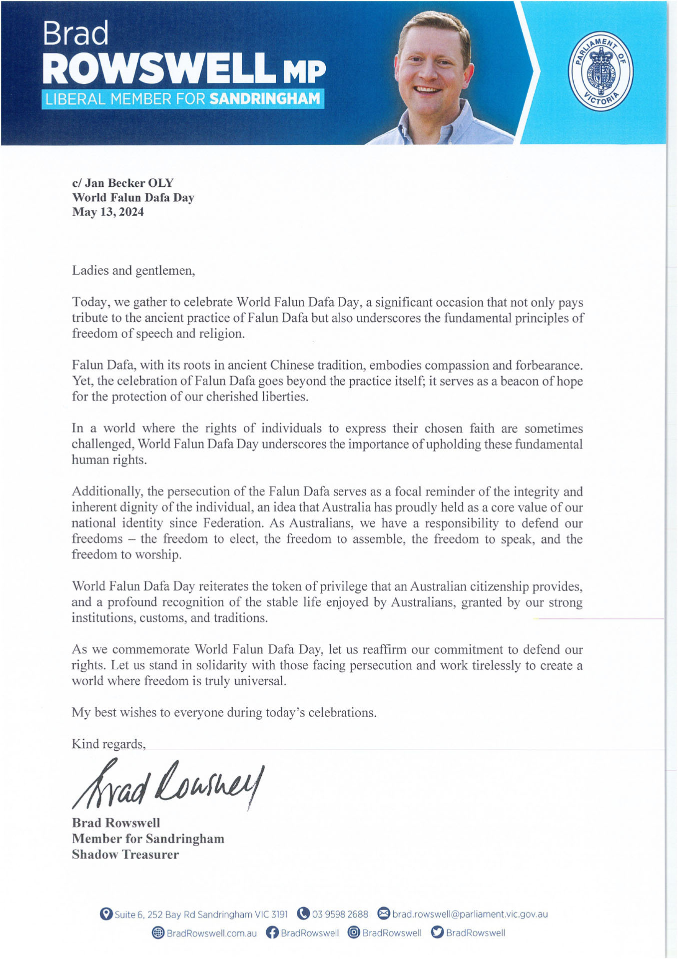 U pismu stoji: “Svjetski dan Falun Dafa služi kao značajna prilika za obilježavanje javnog predstavljanja Falun Dafa, također poznatog kao Falun Gong, narodu Kine u maju 1992. godine. Dok obilježavamo 32 godine od njegovog početka, ovo je trenutak za razmišljanje o trajnim principima Istinitosti, Dobrodušnosti i Tolerancije koji su kamen temeljac ove drevne prakse.