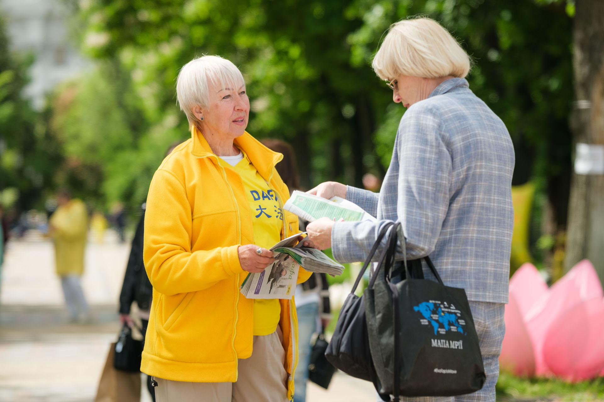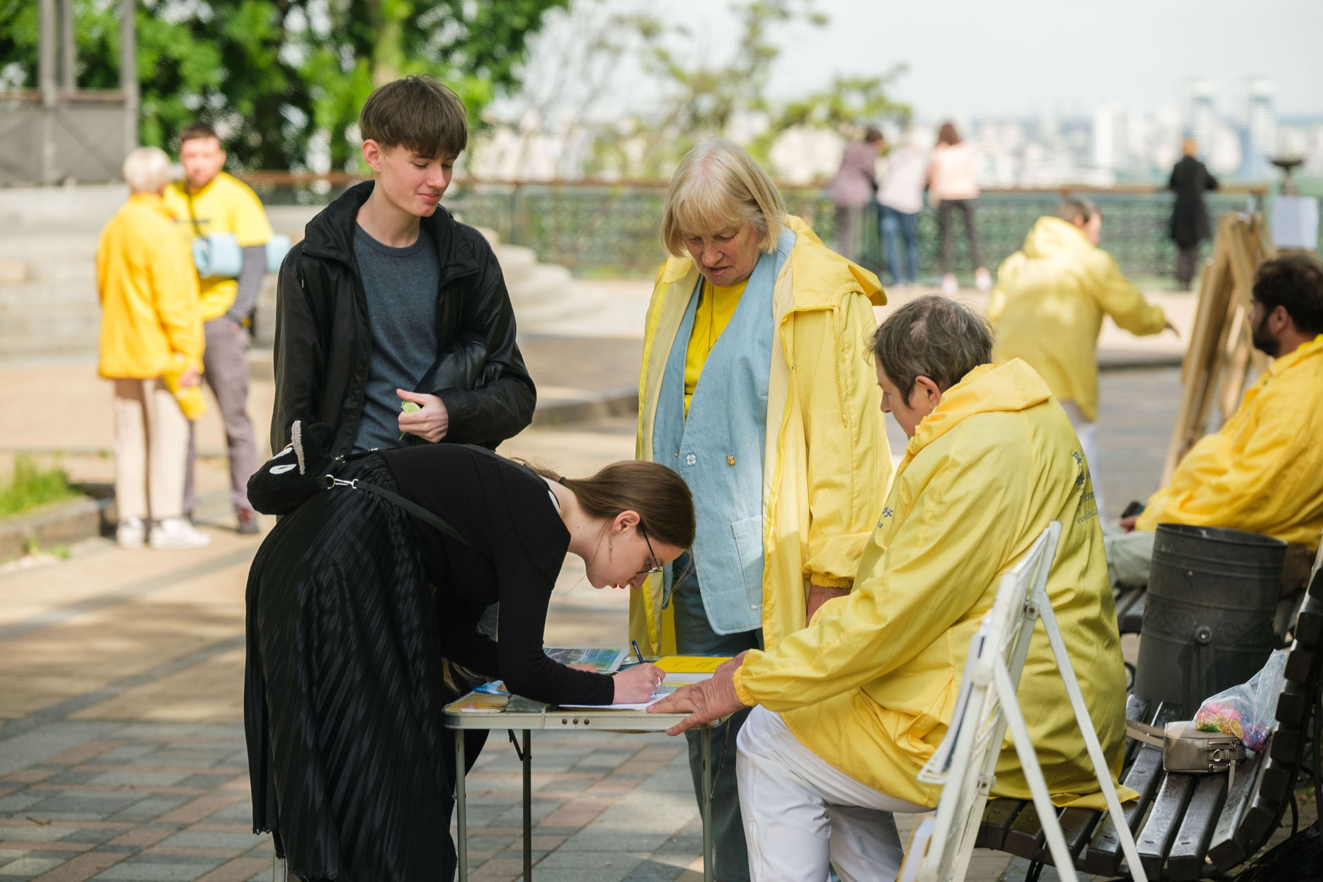 Praktikanti iz različitih dijelova Ukrajine okupili su se, 11. maja 2024., u parku Volodimirska Gorka u centru Kijeva kako bi proslavili 25. Svjetski dan Falun Dafa.