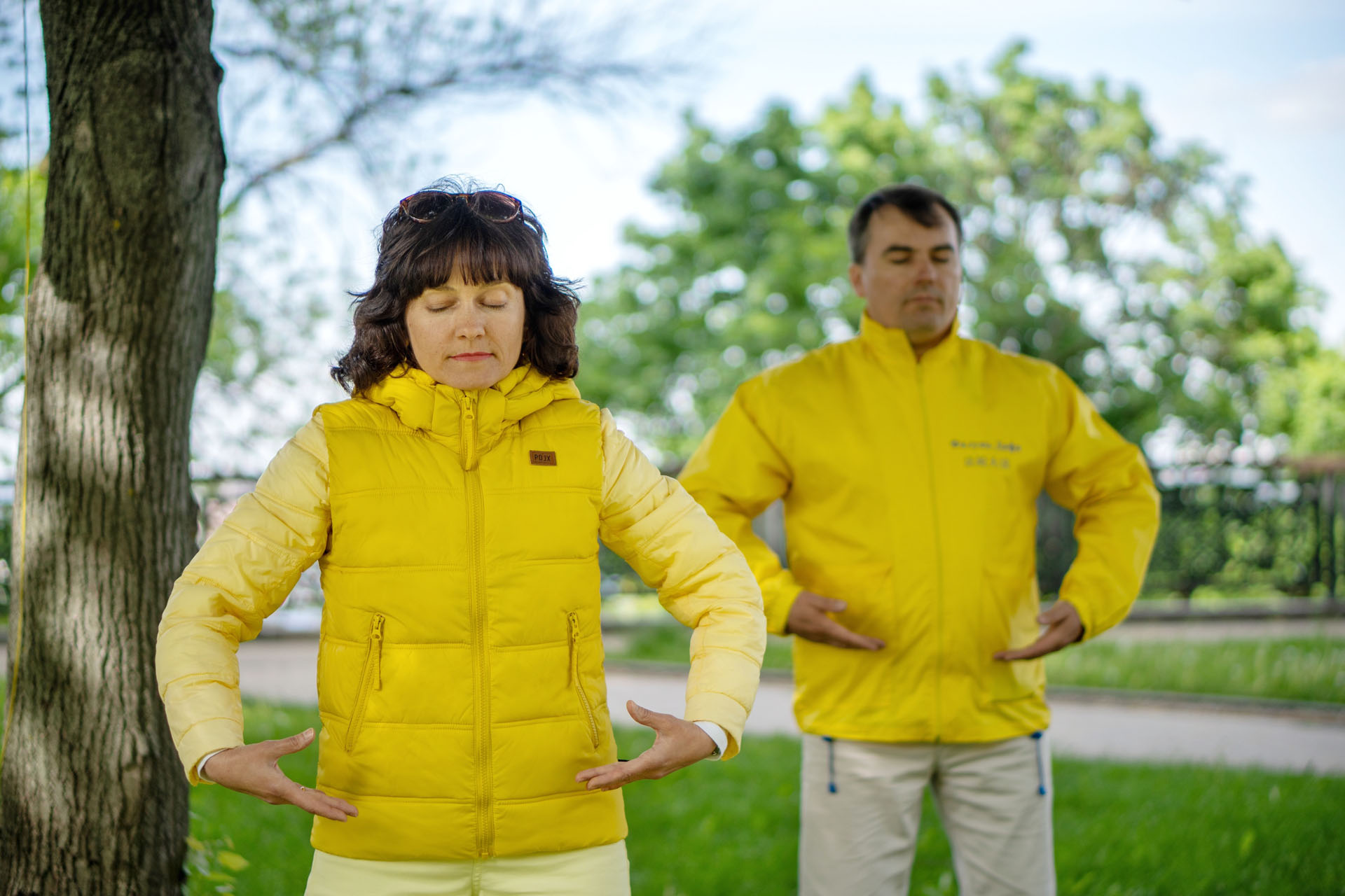 Denis i Karolina prakticiraju Falun Dafa skoro dvije decenije. Nakon što je izbio rat, otišli su vježbati u obližnjm skloništu za zračne napade. Ljudi u skloništu su ih podržavali i postepeno su svi govorili da žele da rade vježbe. Par misli da prakticiranje Falun Dafa može povećati pozitivnu energiju ljudi i da je korisno za zajednicu u cjelini.