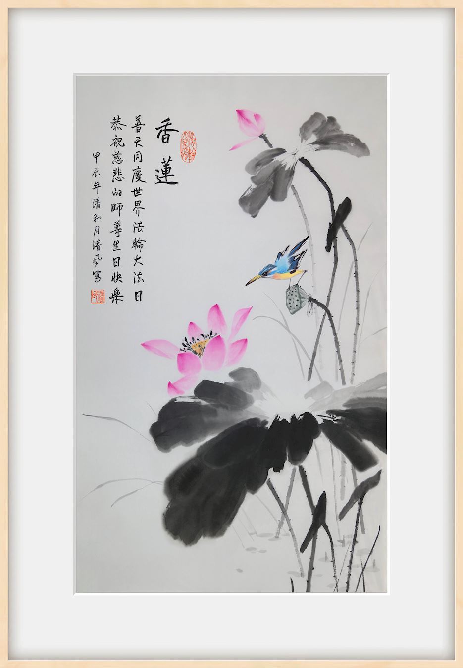 Riječi na slici (s desna na lijevo):  Mirisni lotos. Nebo i Zemlja slave Svjetski dan Falun Dafa, želeći suosjećajnom Učitelju sretan rođendan.