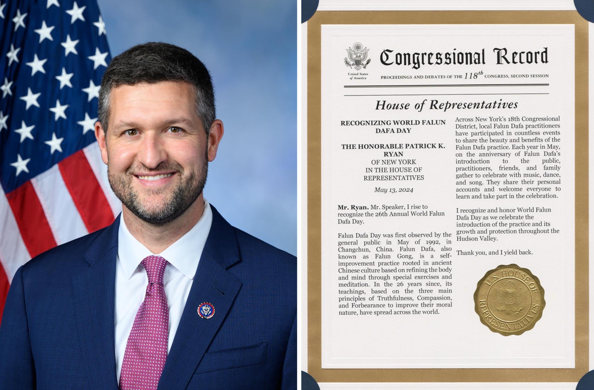 Patrick Ryan, Zastupnik Predstavničkog doma iz New Yorka, je pročitao svoj proglas za Svjetski Falun Dafa u Kapitolu SAD-a 13. maja. Ovo je uključeno u Kongresni zapisnik.