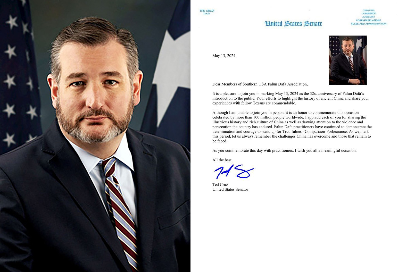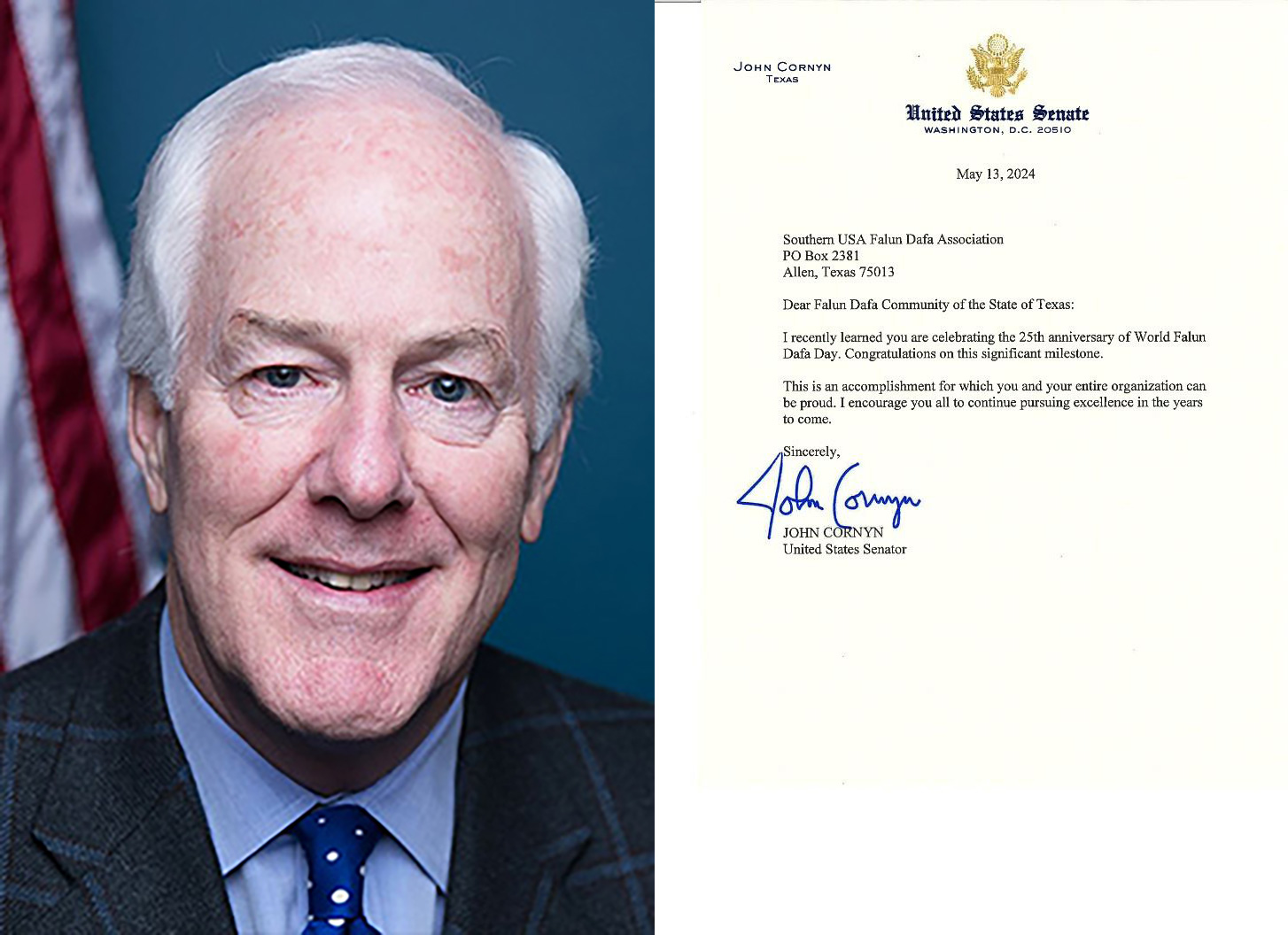 Senatori Ted Cruz i John Cornyn iz Teksasa su također poslali pisma Falun Dafa udruženju južnih SAD-a kako bi im čestitali ovaj poseban dan. U pismu senatora Cruza stoji: „Zadovoljstvo mi je pridružiti vam se u obilježavanju 13. maja 2024. godine, kao 32. godišnjice predstavljanja Falun Dafa javnosti. Vaši napori da stavite akcent na istoriju drevne Kine i podijelite svoja iskustva sa kolegama Teksašanima su za svaku pohvalu.”