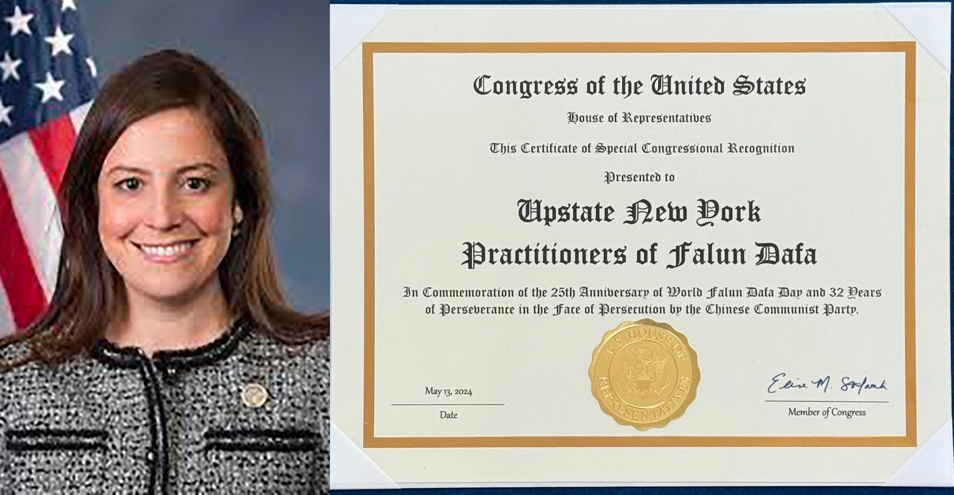 Njujorška kongresmenka Elise Stefanik, predsjedavajuća republikanskog kluba Predstavničkog doma, je napisala: “Ova potvrda o posebnom priznanju Kongresa uručena je praktikantima Falun Dafa iz sjeverne države New Yorka u znak sjećanja na 25. godišnjicu Svjetskog dana Falun Dafa i 32 godine istrajnosti u suočavanju s progonom od strane Komunističke partije Kine.”