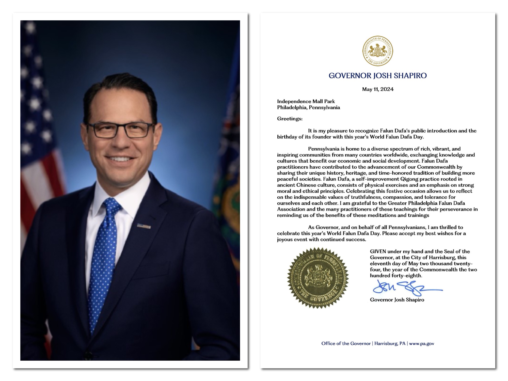Pismo guvernera Pensilvanije Josha Shapira od 11. maja glasi: “...Falun Dafa praktikanti su doprinijeli napretku našeg Commonwealtha dijeleći svoju jedinstvenu istoriju, naslijeđe i tradiciju izgradnje mirnijih društava. Obilježavanje ove svečane prilike nam omogućava da razmislimo o neophodnim vrijednostima Istinitosti, Dobrodušnosti i Tolerancije za sebe i jednih za druge. Zahvalan sam Falun Dafa udruženju Velike Filadelfije i brojnim praktikantima ovih učenja na njihovoj upornosti da nas podsjećaju na prednosti ovih meditacija i treninga.