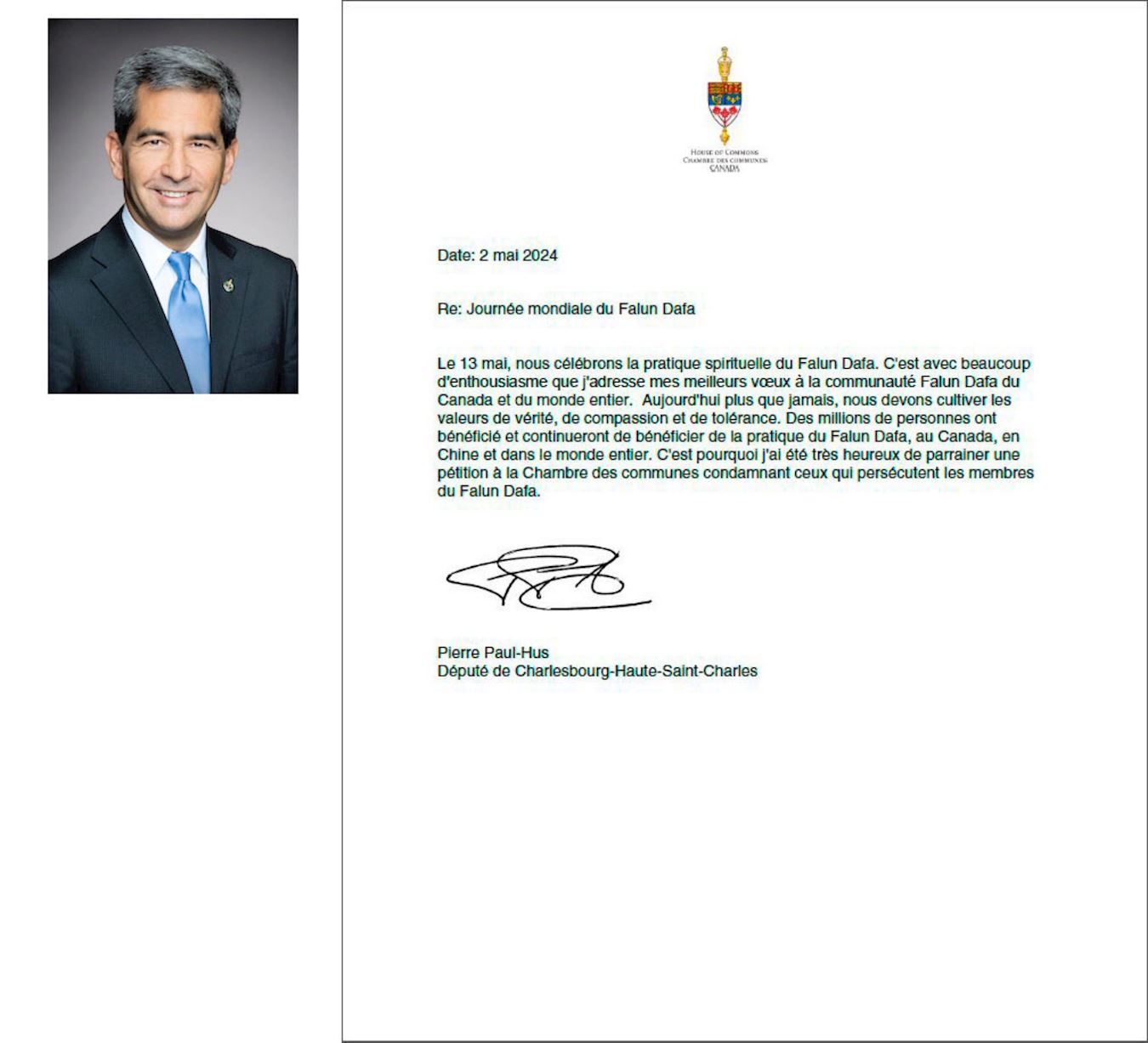 U svojoj čestitki, zastupnik Pierre Paul-Hus je napisao: “Na dan obilježavanja Dana Falun Dafa, 13. svibnja, s velikim entuzijazmom upućujem svoje najbolje želje Falun Dafa praktikantima u Kanadi i diljem svijeta. Sada, više nego ikad, moramo njegovati vrijednosti Istinitosti-Dobrodušnosti-Tolerancije. Tisuće ljudi u Kanadi, Kini i diljem svijeta su imale te nastavljaju imati koristi od prakticiranja Falun Dafa, zbog čega sam više nego sretan što mogu pokrenuti peticiju u Donjem domu parlamenta osuđujući one koji progone Falun Dafa praktikante.”