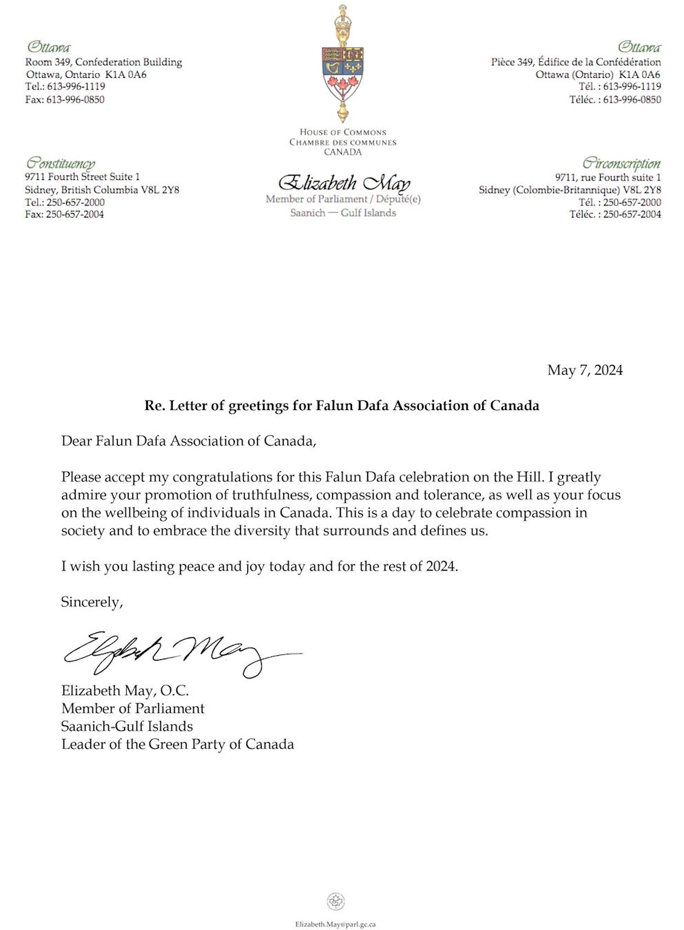 “Povodom proslave 32. godišnjice propagiranja Falun Dafa, veliko mi je zadovoljstvo izraziti vam svoje iskrene želje i pohvaljujem vaše napore glede održavanja univerzalnih vrijednosti Istinitosti-Dobrodušnosti-Tolerancije, odnosno vjerskih sloboda, kao i vaš otpor svim oblicima diskriminacije i zastrašivanja.”