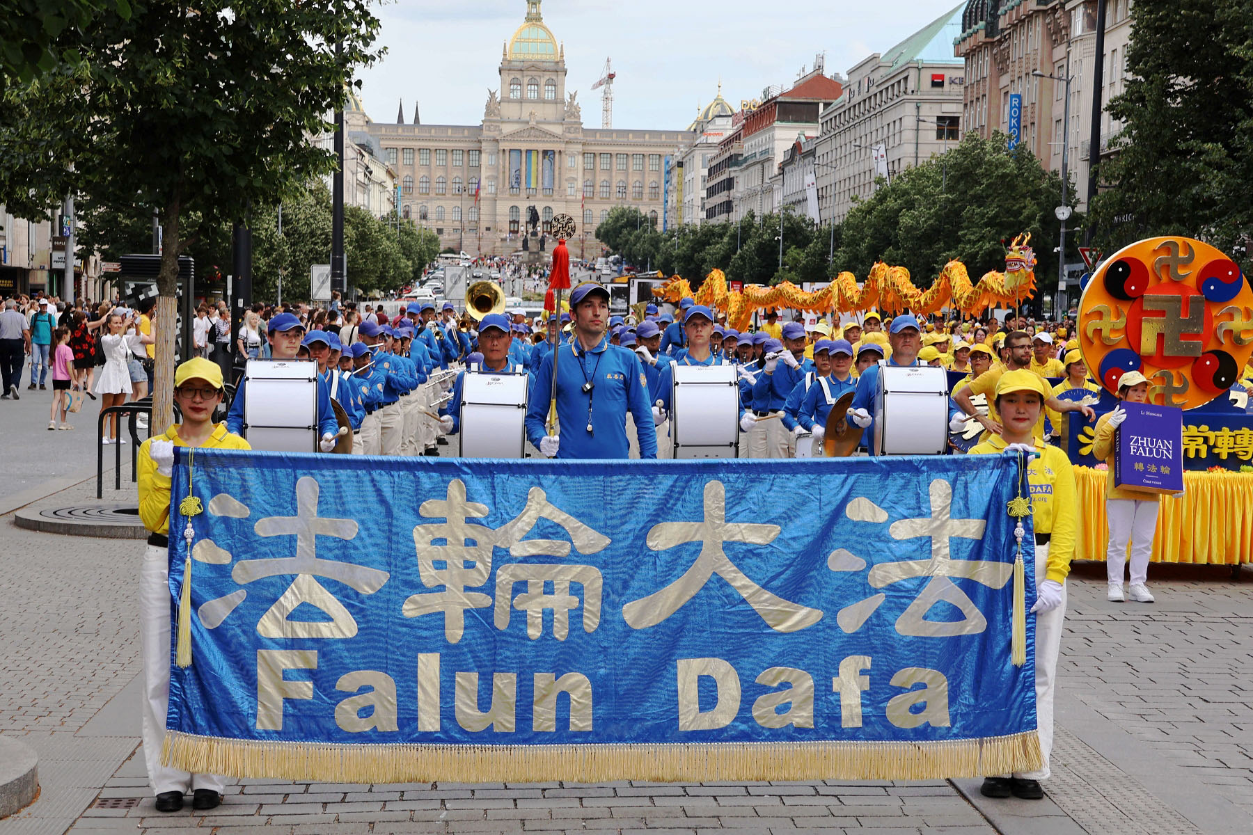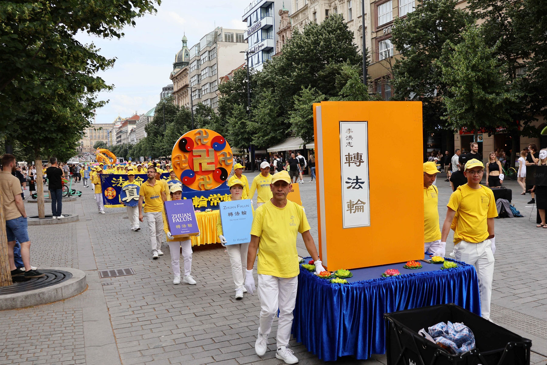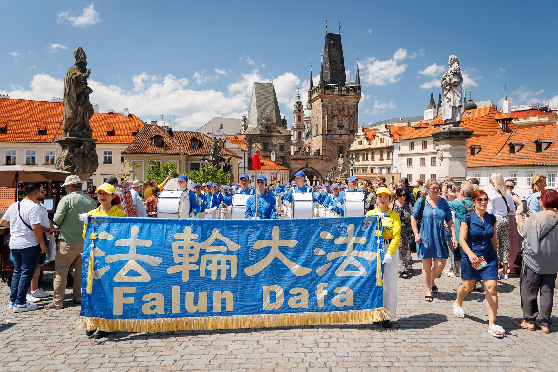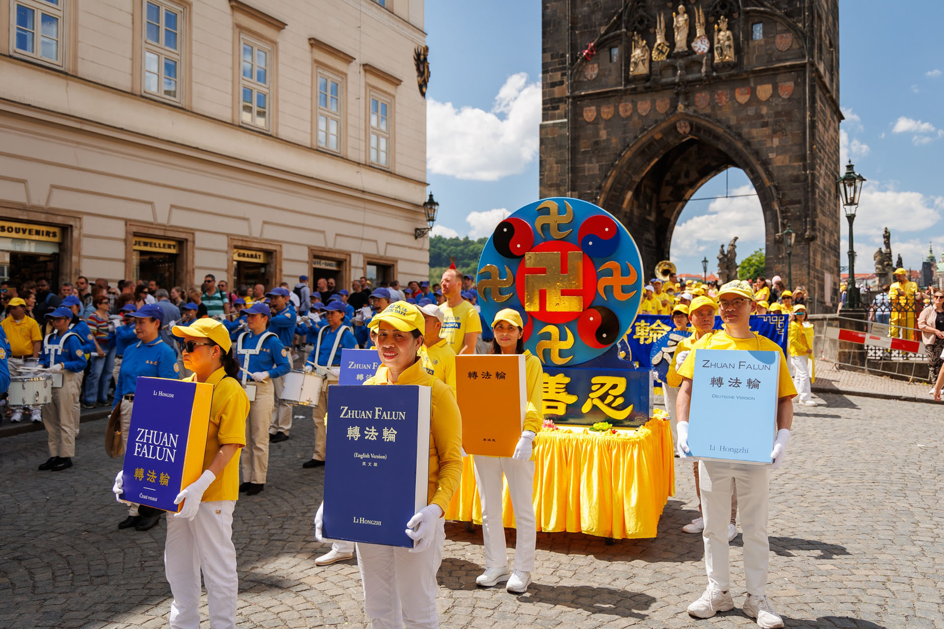 Parada je krenula sa Hradčanskog trga, prešla Karlov most i na kraju stigla do Starog gradskog trga gdje su praktikanti izveli razne izvedbe. Mnogi turisti su se fotografisali sa muzičarima Tian Guo Marching Banda, modelom knjige Zhuan Falun i transparentima sa zlatnim kineskim slovima za “Istinitost, Dobrodušnost i Toleranciju.”