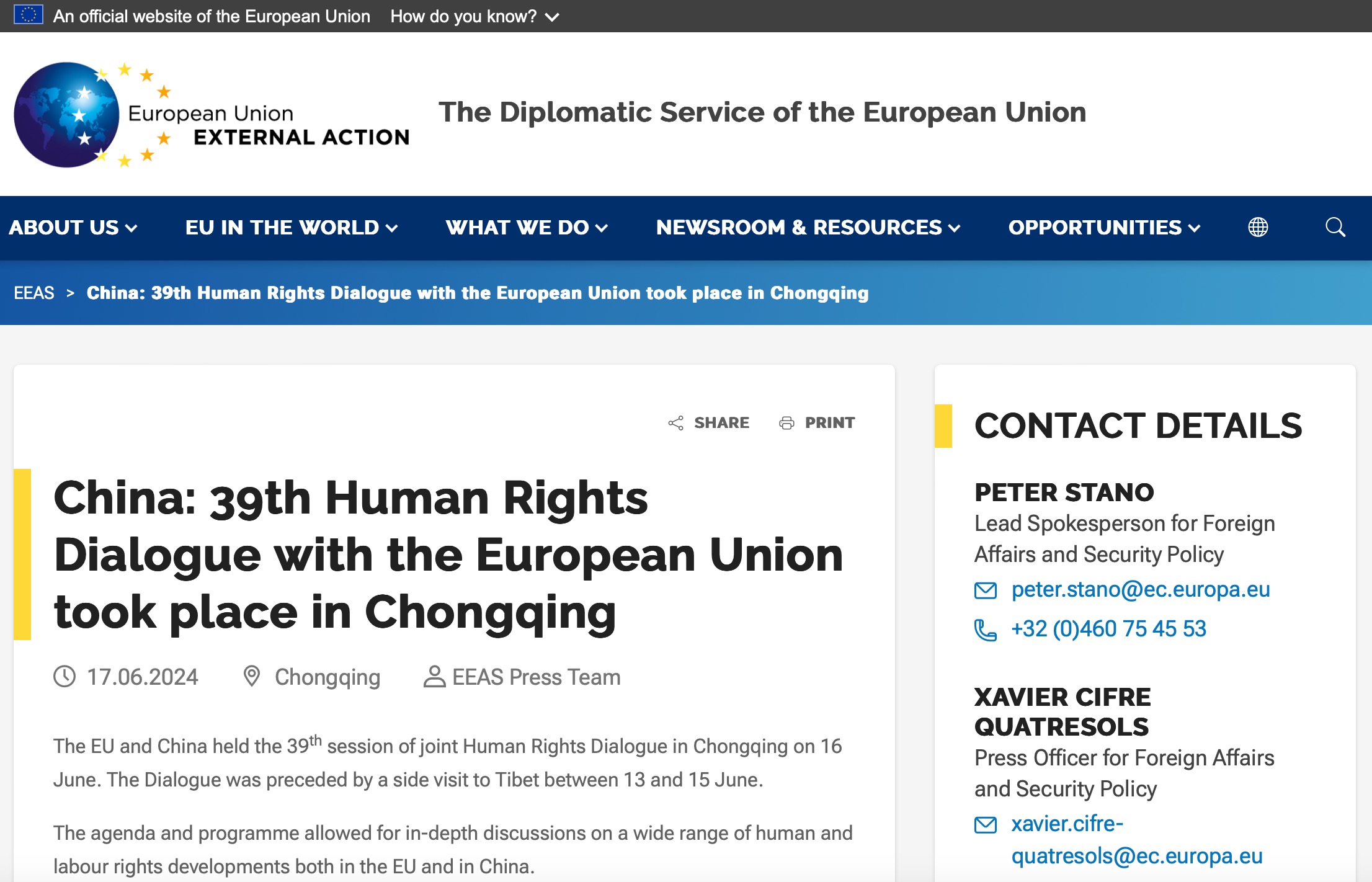 Evropska unija (EU) je 6. juna 2024., sa Komunističkom partijom Kine (KPK), u Čongkingu održala 39. dijalog o ljudskim pravima. U izjavi za javnost koju je EU objavila 17. juna izražena je konstantna zabrinutost zbog uskraćivanja osnovnih ljudskih prava u Kini, uključujući suzbijanje slobode izražavanja i slobode veroispovesti.