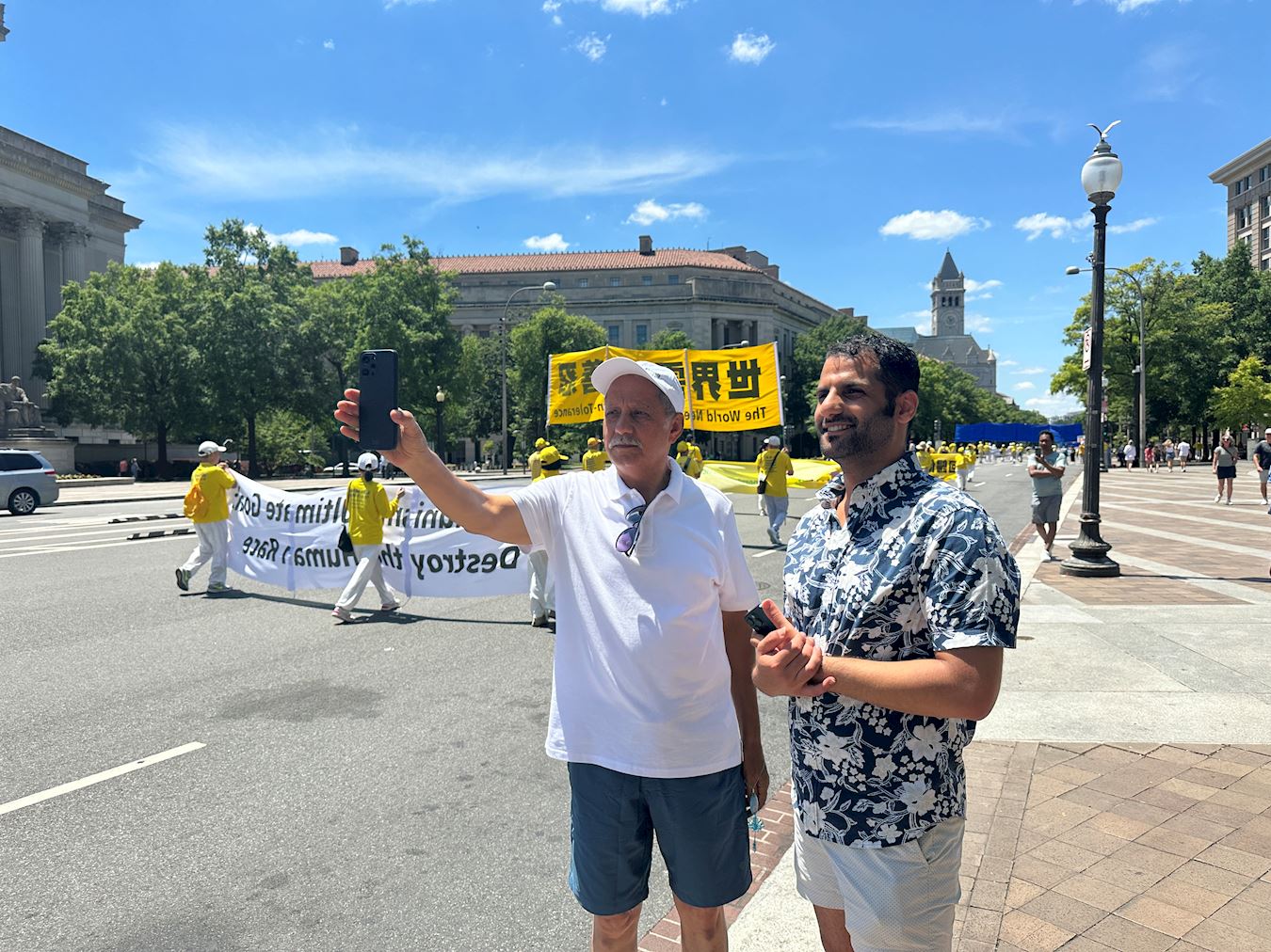 Sam i njegov otac, turisti iz Jemena, su kazali da su bili impresionirani brojem ljudi na paradi. Sam je rekao da je njegov otac pojurio prema paradi čim su izašli iz metroa. Nakon što je pročitao transparente, Sam je rekao da su svijetu potrebni Istinitost, Dobrodušnost i Tolerancija i da je to vrlo dobra poruka. Rekao je da je zainteresovan da sazna više o Falun Dafa i da će to razmotriti kada se vrati kući.