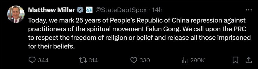 Objava glasi: „Danas obeležavamo 25 godina od početka represije Narodne Republike Kine nad praktikantima duhovnog pokreta Falun Gong. Pozivamo NRK da poštuje slobodu veroispovesti i uverenja i oslobodi sve one koji su zatvoreni zbog svojih uverenja.”