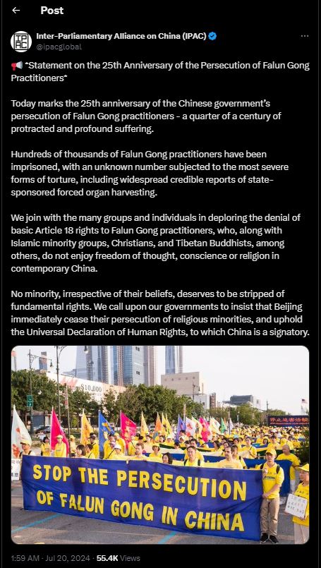 IPAC je objavila „Izjavu o 25. godišnjici progona Falun Gong praktikanata.“