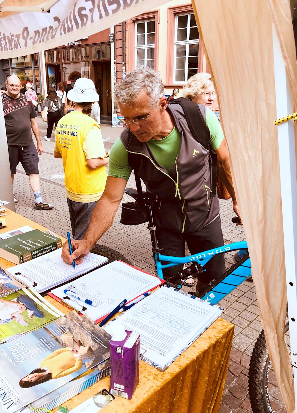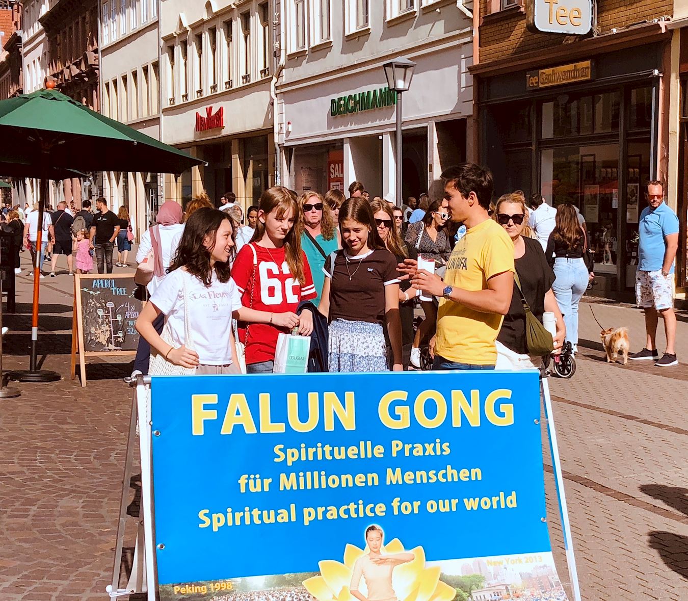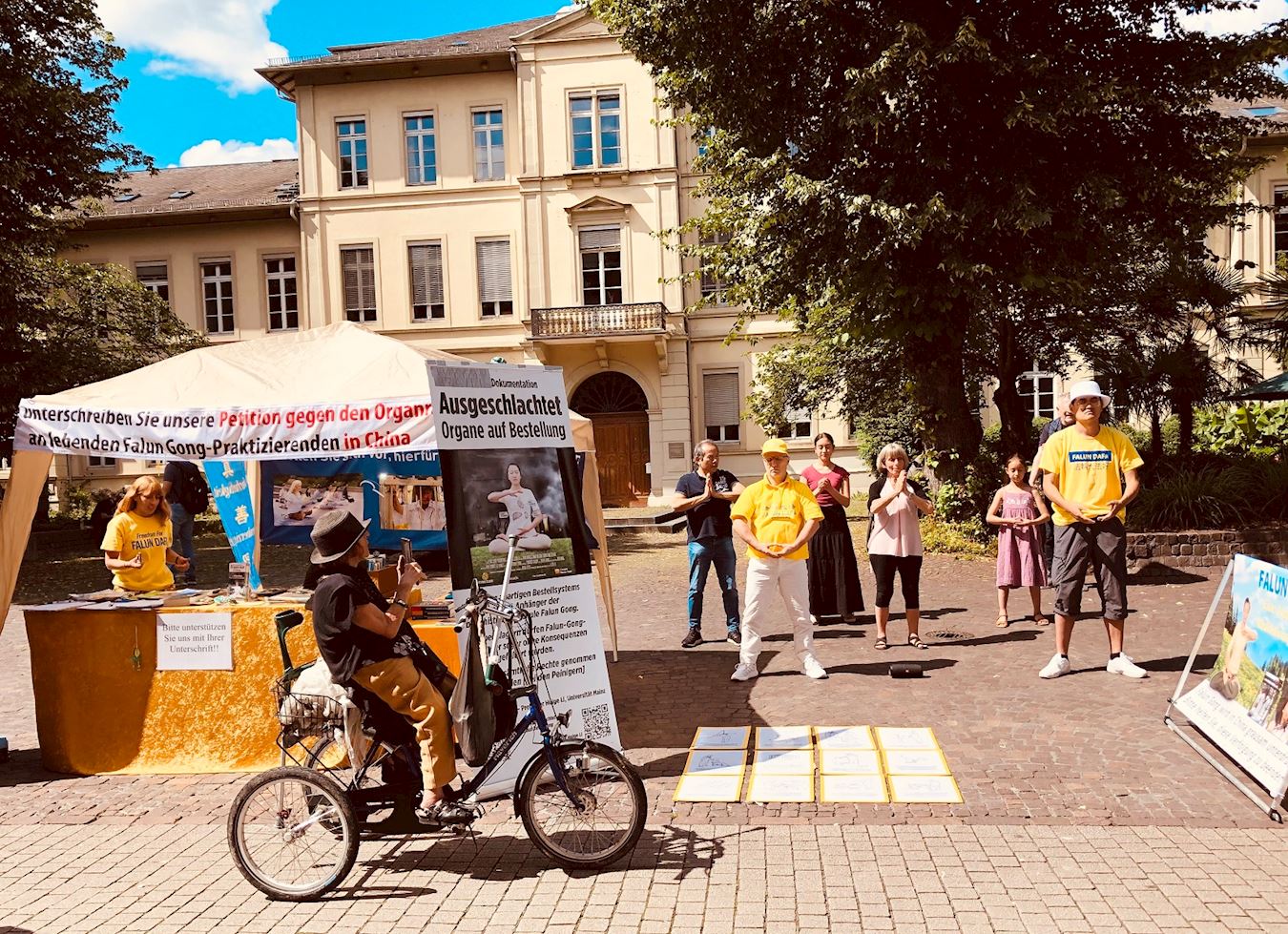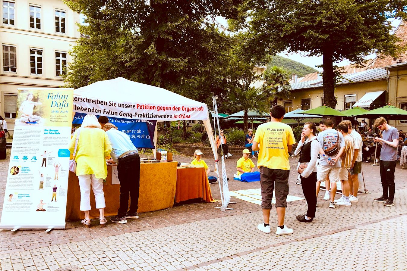 Kako bi obilježili 25. godišnjicu napora praktikanata Falun Gonga da okončaju progon u Kini, praktikanti iz njemačke metropolitanske regije Rhine-Neckar održali su aktivnosti za podizanje svijesti na popularnoj ulici Hauptstrasse u Heidelbergu 13. srpnja 2024. Oni su demonstrirali vježbe, prikupljali potpise, dijelili informacije o Falun Gongu i pozivali na prekid progona od strane Komunističke partije Kine (KPK).