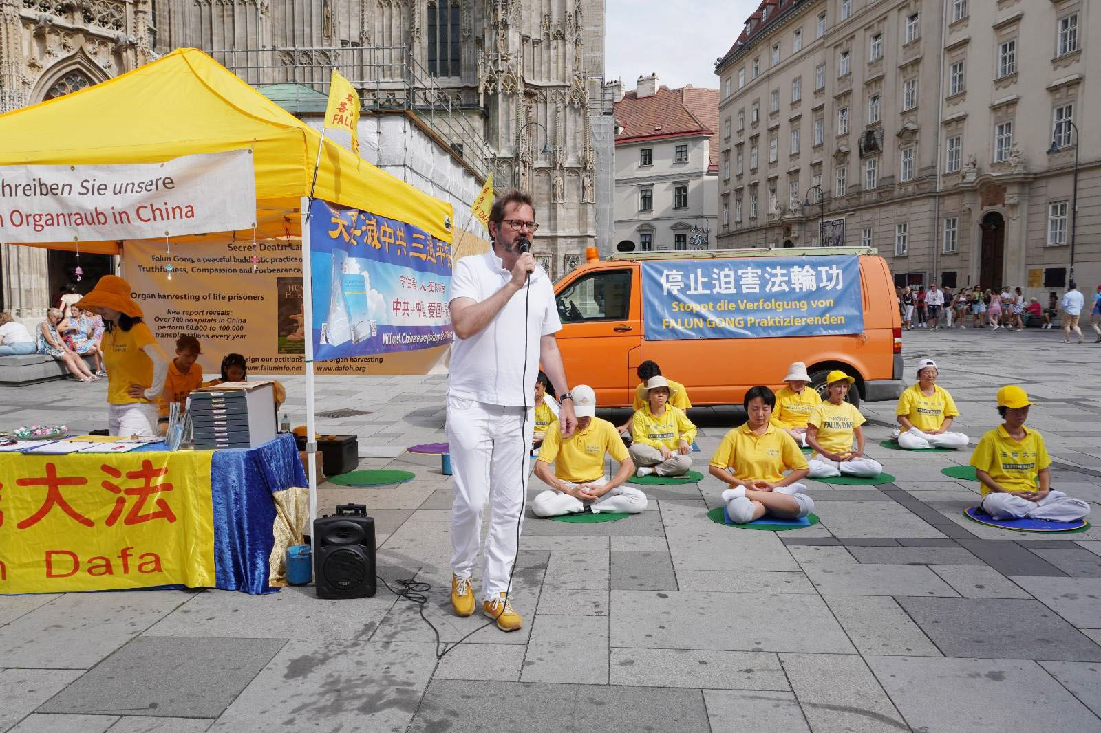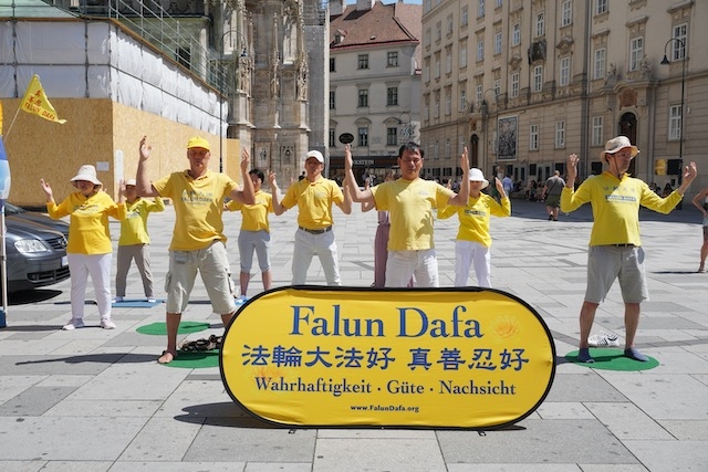 Obeležavajući 25. godišnjicu nastojanja Falun Gong praktikanata da okončaju progon od strane Komunističke partije Kine (KPK), praktikanti su 13. jula 2024. održali miting na Štefansplacu u Beču. Oni su demonstrirali vežbe i postavili su info panoe o 25-godišnjem progonu.