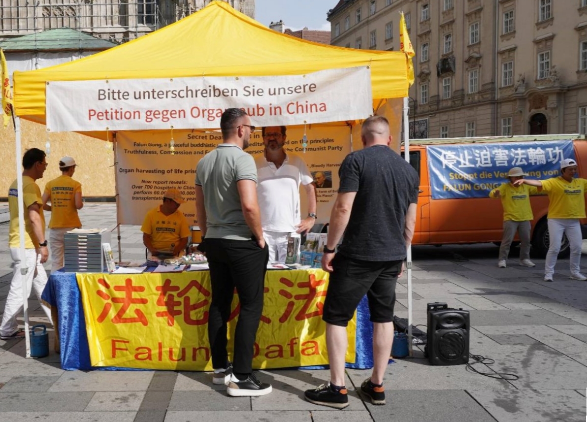 Štefansplac je tog jutra bio prepun. Mnogi ljudi su prišli informativnom pulti i nakon razgovora sa praktikantima potpisali peticiju kojom se poziva na prekid progona i zaustavljanje živog uzimanja organa koje sprovodi KPK.