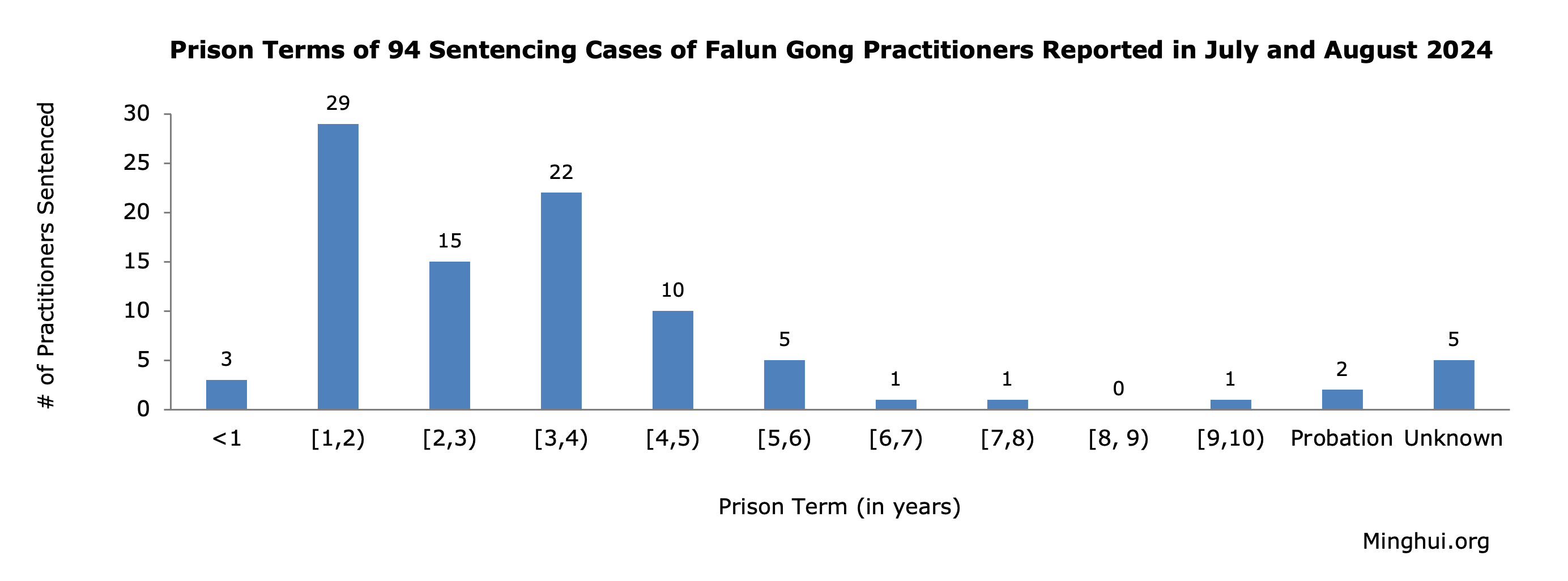 U julu i avgustu 2024. prijavljena su ukupno 94 slučaja Falun Gong praktikanata osuđenih zbog svoje vjere.