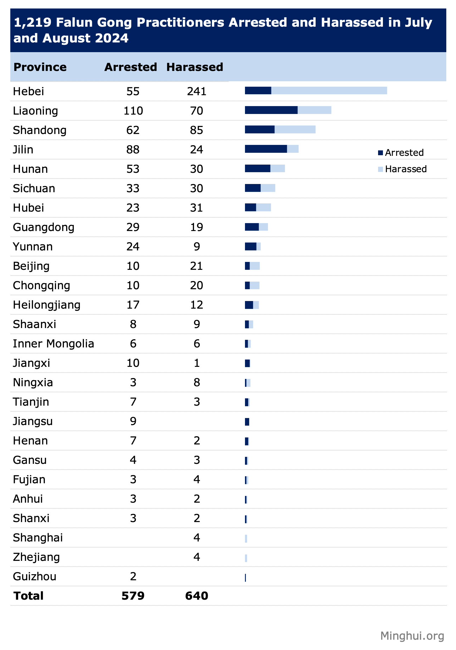 U 1.219 slučajeva je uključivalo 579 hapšenja i 640 slučajeva uznemiravanja. 579 slučajeva hapšenja uključuje 167 koji su se desili u prvoj polovini 2024. godine, 277 u julu, 112 u avgustu i 23 u nepoznatim mjesecima. 640 slučajeva uznemiravanja se smanjilo na 242 u prvoj polovini godine, 259 u julu, 112 u avgustu i 27 sa nepoznatim mjesecima. Kašnjenje u izvještavanju se dešava zbog cenzure informacija u Kini koja je pod komunističkim režimom, što dopisnicima Minghui.org otežava pravovremeno prikupljanje, provjeru i slanje podataka na web stranicu. Praktikanti koji su i sami pretrpjeli progon također se suočavaju s opasnošću od osvete kada prijavljuju izvještaje o progonu sa svojim pravim imenima.