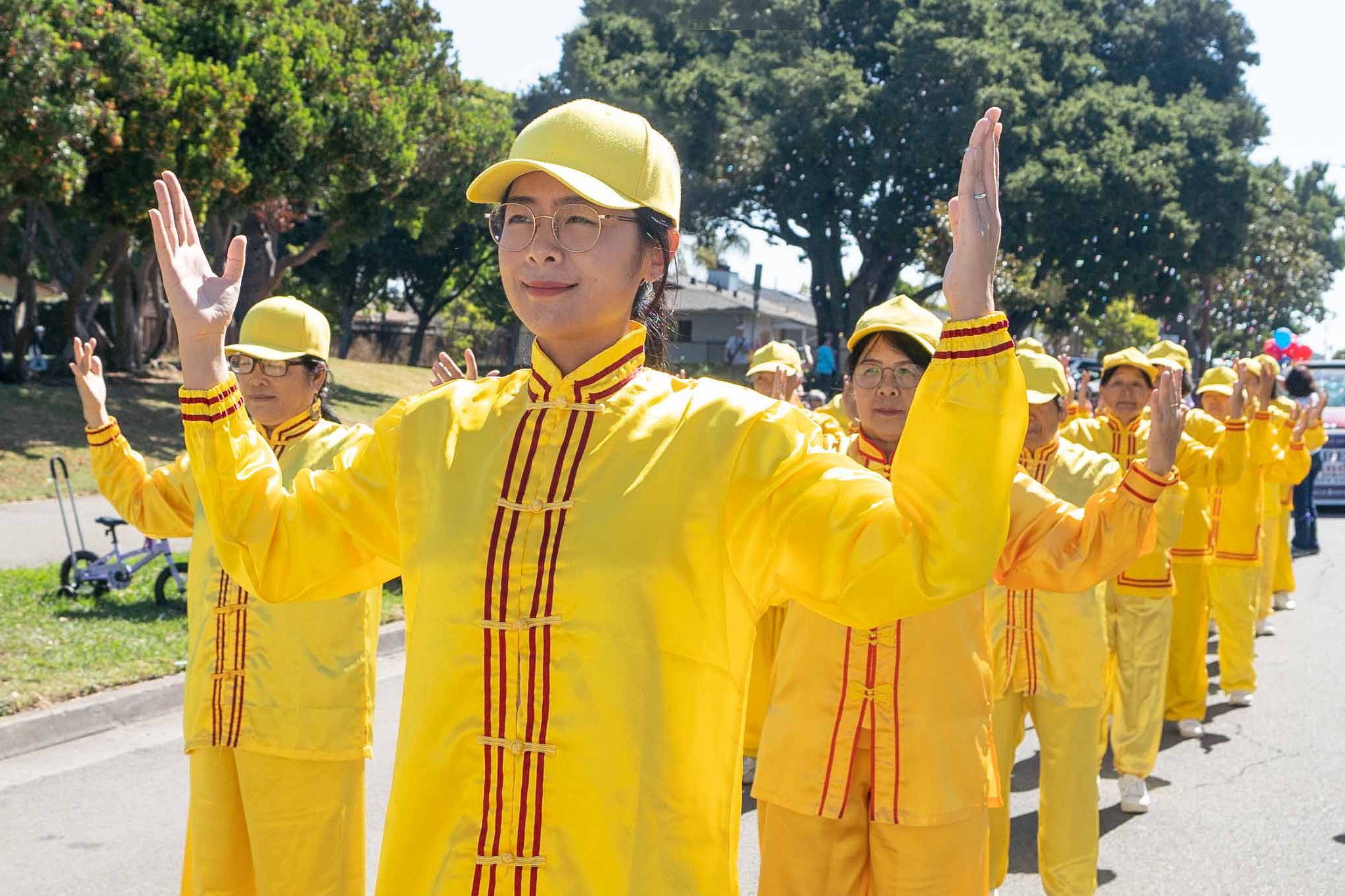 Dok su praktikanti marširali pored sudaca, MC ih je predstavio: “Falun Dafa se temelji na principima Istinitosti, Dobrodušnosti, Tolerancije. Ovo je praksa uma i tijela i podučava se besplatno. Poduke se održavaju u raznim dijelovima područja zaljeva i svi su dobrodošli da se prijave.”