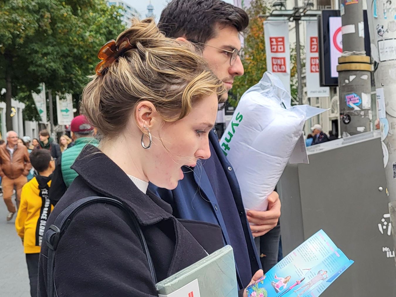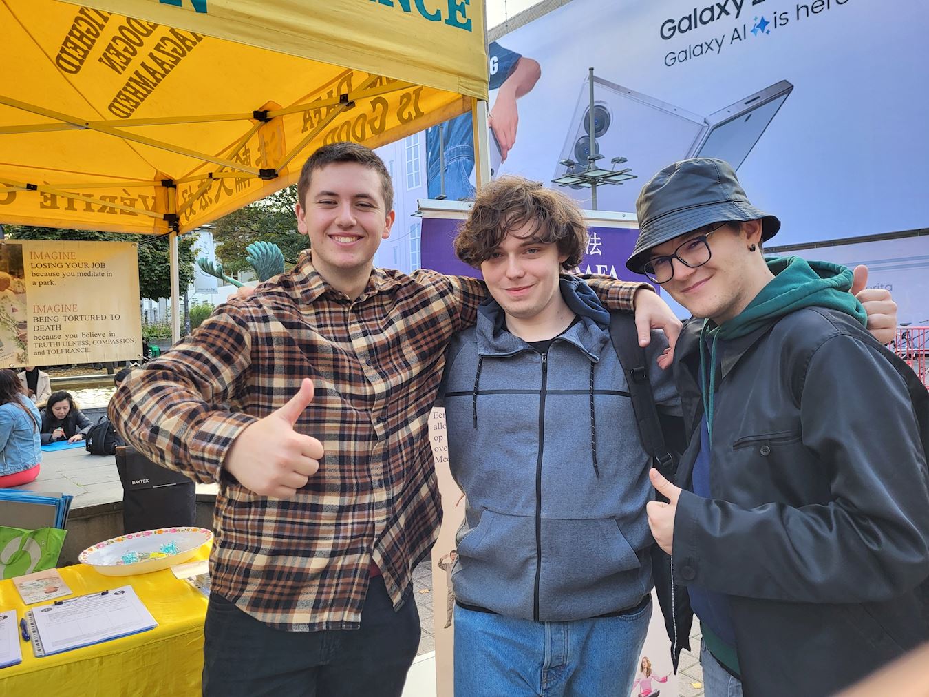 Korneel van de Vijiver, Gilbert i Steven Arnauts, tri belgijska univerzitetska studenta sa Univerziteta u Gentu koji studiraju nauku i inženjerstvo privučeni su miroljubivom meditacijom. Nakon što su neko vreme posmatrali, prišli su panou sa informacijama. To je bio prvi put da su čuli za Falun Gong. Dugo su razgovarali sa praktikantima.