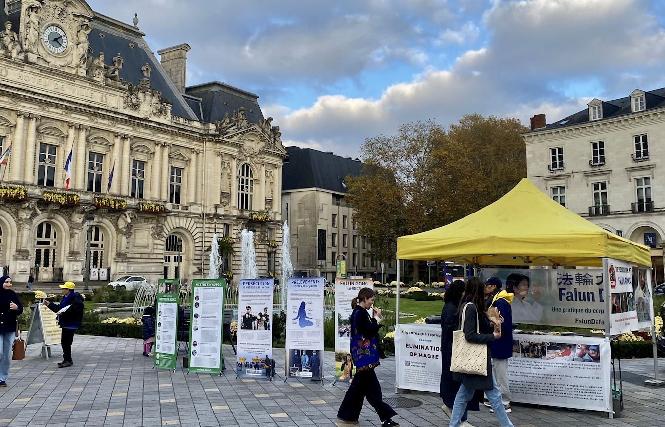 Praktikanti su 15. novembra postavili informativni štand i postere na trgu Jean Jaurès (Place Jean Jaurès) ispred Gradske vijećnice u Toursu kako bi ljudima predstavili Falun Dafa. Trg Jean Jaurès je popularna pješačka ulica.