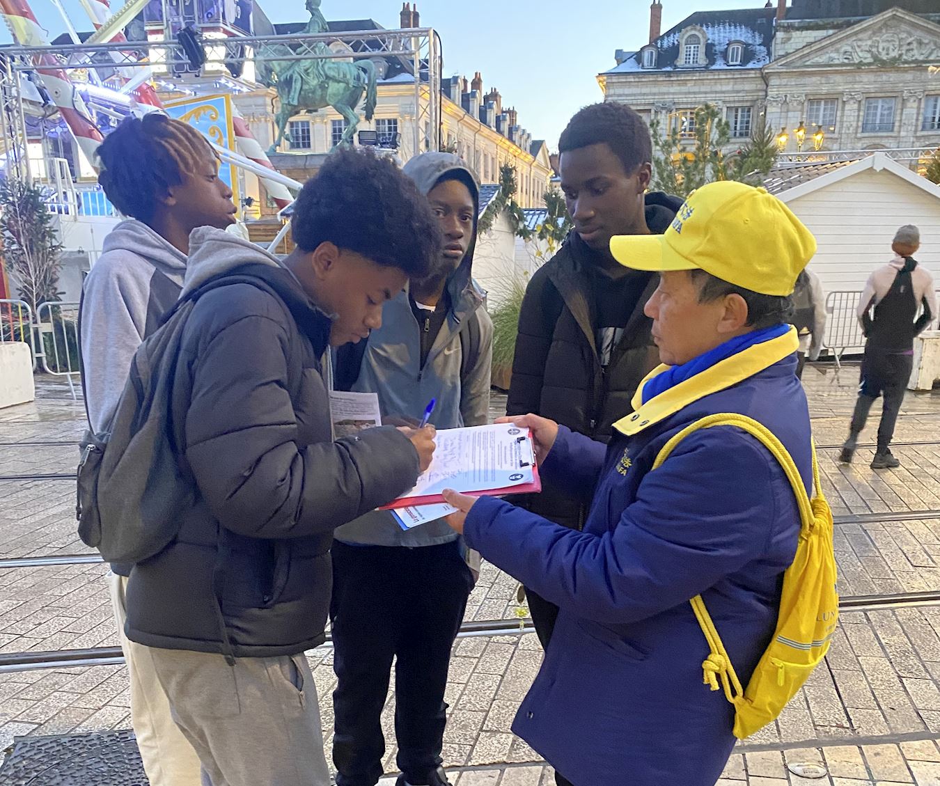 Grupa od pet srednjoškolaca je tog dana, nakon škole, otišla na Place du Martroi. Svi su potpisali peticiju. Rekli su da je nevjerovatno da vlast muči svoj narod jer su radili nešto da poboljšaju svoje fizičko i psihičko zdravlje. Oni su osudili kineski režim zbog kršenja osnovnih prava ljudi, uključujući slobodu vjerovanja, koju francuski narod veoma cijeni.