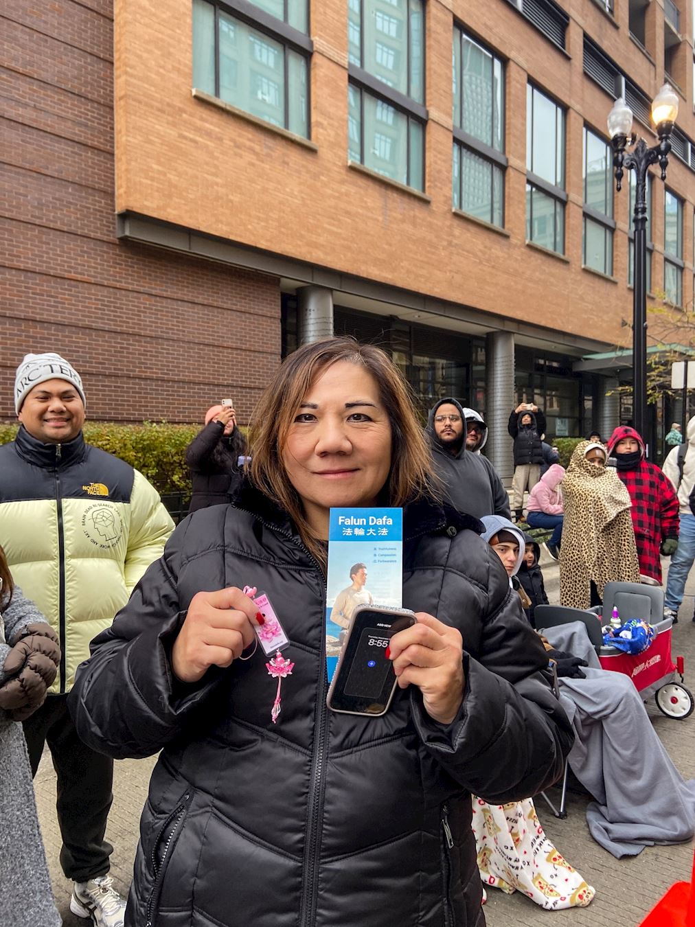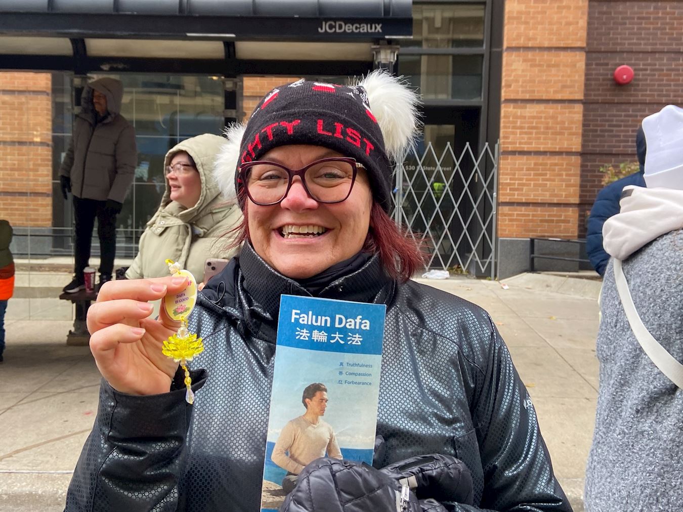 Falun Dafa praktikantica Sharon svake godine učestvuje na Paradi zahvalnosti u Čikagu. Rekla je da je, iako je ove godine bilo veoma hladno, rado učestvovala. “Kada su se ljudi smiješili i mahali nam, vidjela sam njihove oči i osmijehe”, rekla je. “Toliko ljudi nas je slikalo. Osjećala sam se odlično!” Dodala je da je još važnije to, što je ovo bila prilika da svi saznaju više o Falun Dafa, mirnoj i lijepoj praksi. Bila je sretna što su ljudi imali ovu priliku.