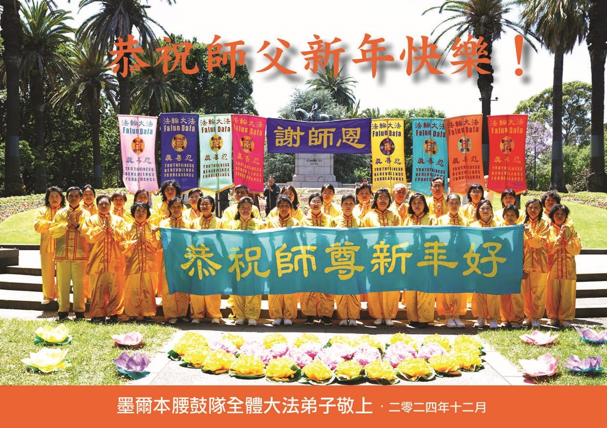 Falun Dafa praktikanti članovi melburnškog tima Bubnjevi oko struka s poštovanjem žele Učitelju sretnu Novu godinu