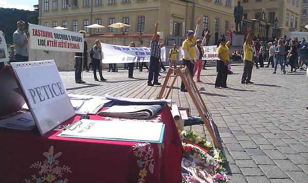 Falun Gong praktikanti su dijelili letke i pamflete izvan praškog dvorca i razgovarali s ljudima o Falun Gongu i progonu. Oni su također pročitali „Obavijest da se istraži uključenost Zhanga Gaolia, člana stalnog odbora političkog biroa KKP u progon Falun Gonga“ koju je izdala Svjetska organizacija za istraživanje progona Falun Gonga.