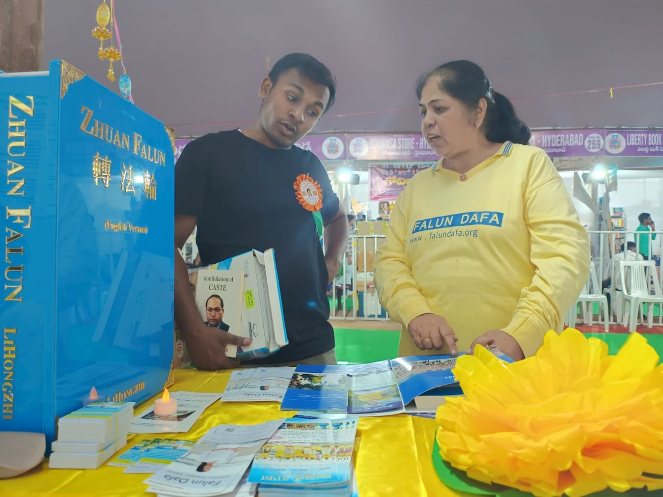 Praktikanti su na sajmu imali dva štanda na kojima su izložili Falun Dafa knjige i publikacije, i demonstrirali Falun Dafa vježbe. Knjige su bile dostupne za kupovinu na telugu, engleskom i hindi jeziku.