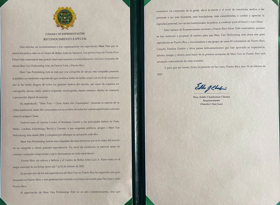 Shen Yun je izveo pet nastupa u San Huanu, Portoriko, od 7. do 10. februara. Prije posljednjeg nastupa 10. februara, članove Shen Yun New World Company pozvao je Eddie Charbonier Chinea, član Predstavničkog doma Portorika, u obilazak zgrade Kapitola.
