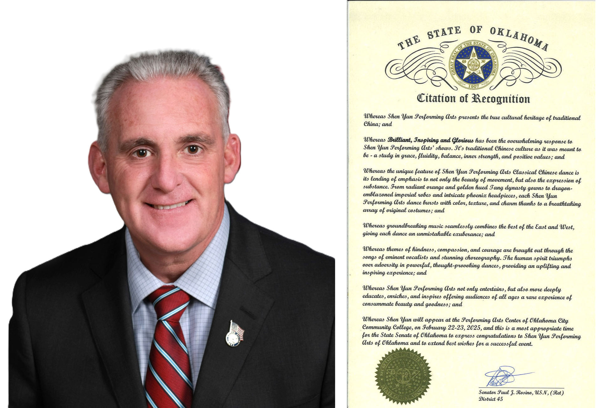 Državni senator Rosino je napisao: "Budući da je reakcija na predstave Shen Yun Performing Arts bila briljantna, inspirativna i veličanstvna."