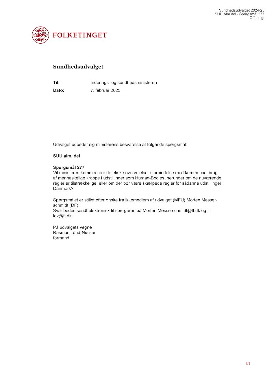 Pitanje 277: “Hoće li ministar komentirati etička razmatranja u vezi s komercijalnom upotrebom ljudskih tijela na izložbama kao što je Ljudska tijela, uključujući jesu li trenutna pravila dostatna ili trebaju li postojati stroža pravila za takve izložbe u Danskoj?”