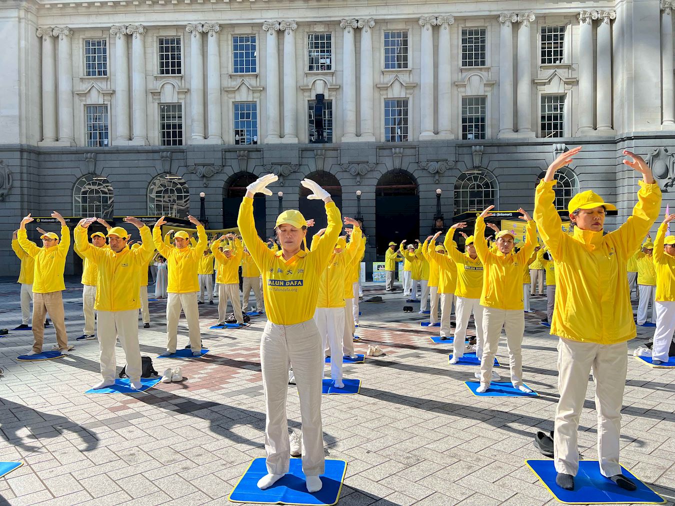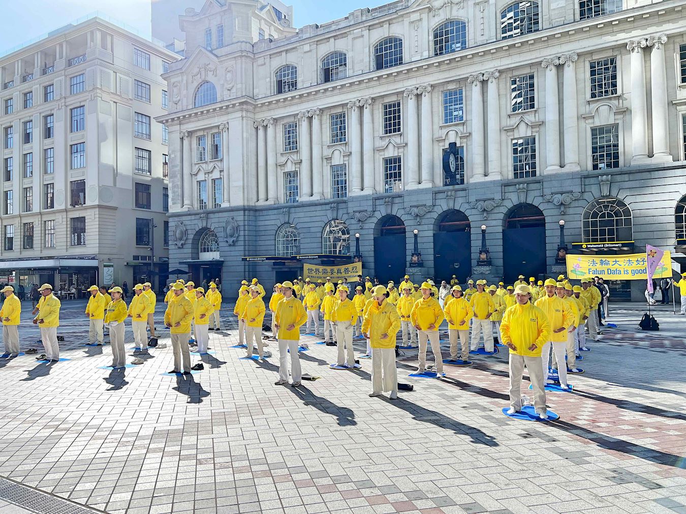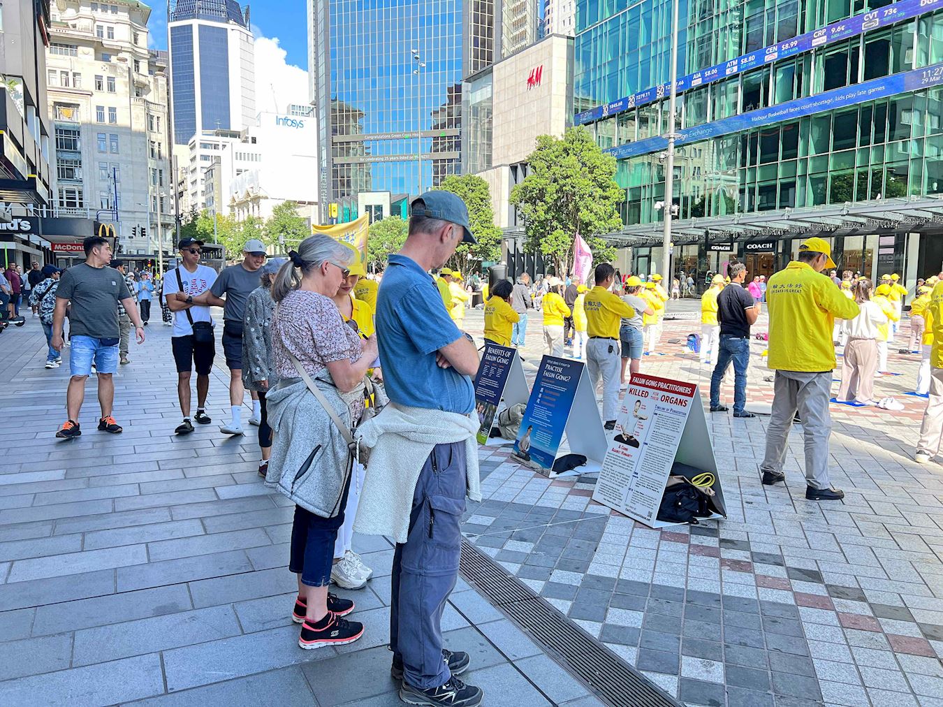 Obučeni u žute majice i bijele pantalone, praktikanti su radili vježbe uz umirujuću muziku. Organizovan i miran prizor je naveo ljude da zastanu i posmatraju. U tom području se neprestano odvija pješački promet, a i ogromni se krstareći brod zaustavio u zaljevu. Turisti iz cijelog svijeta kao i lokalni kupci su se zaustavljali na informativnom štandu. Neki su čitali prikazane informacije dok su drugi fotografisali ili razgovarali sa praktikantima kako bi saznali više o Falun Dafa. Neki ljudi su pak na licu mjesta naučili vježbe.
