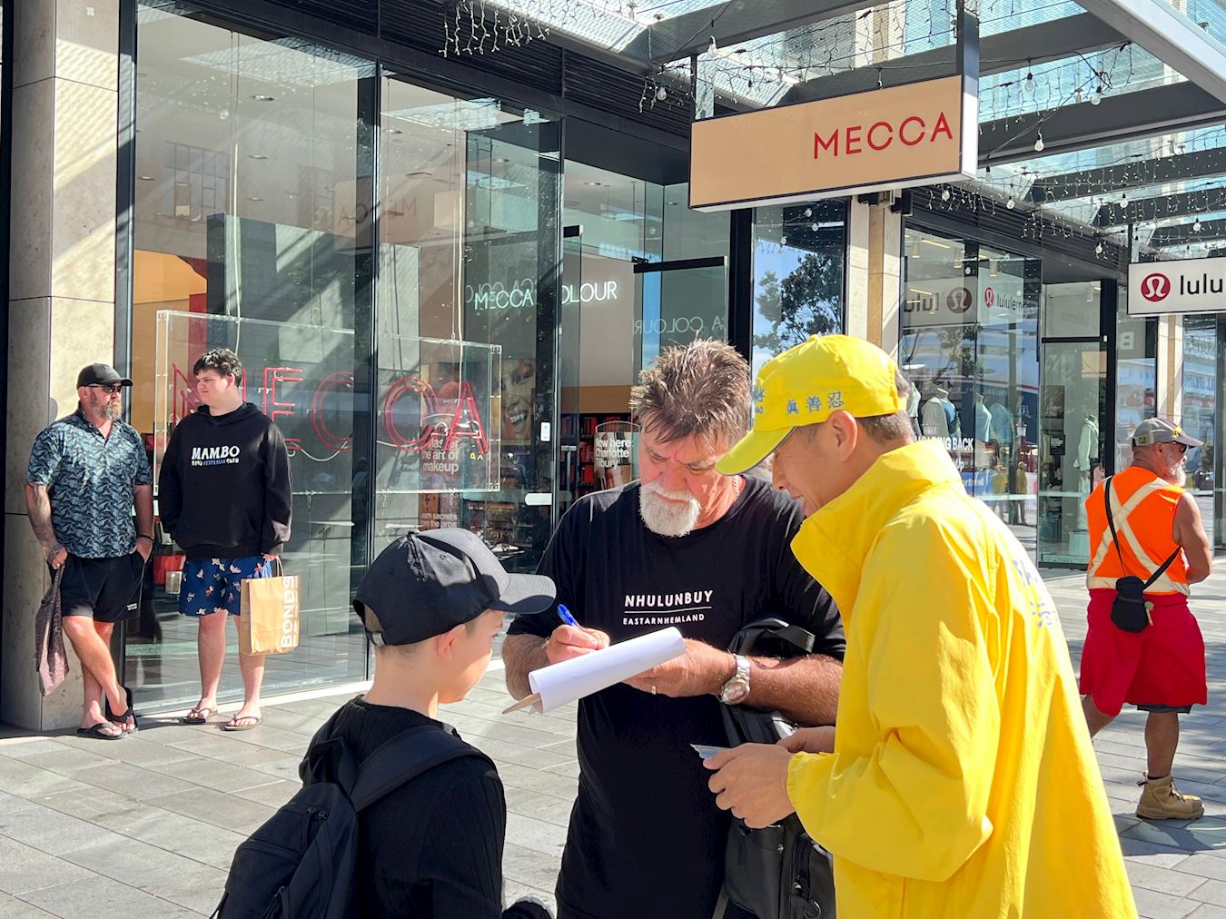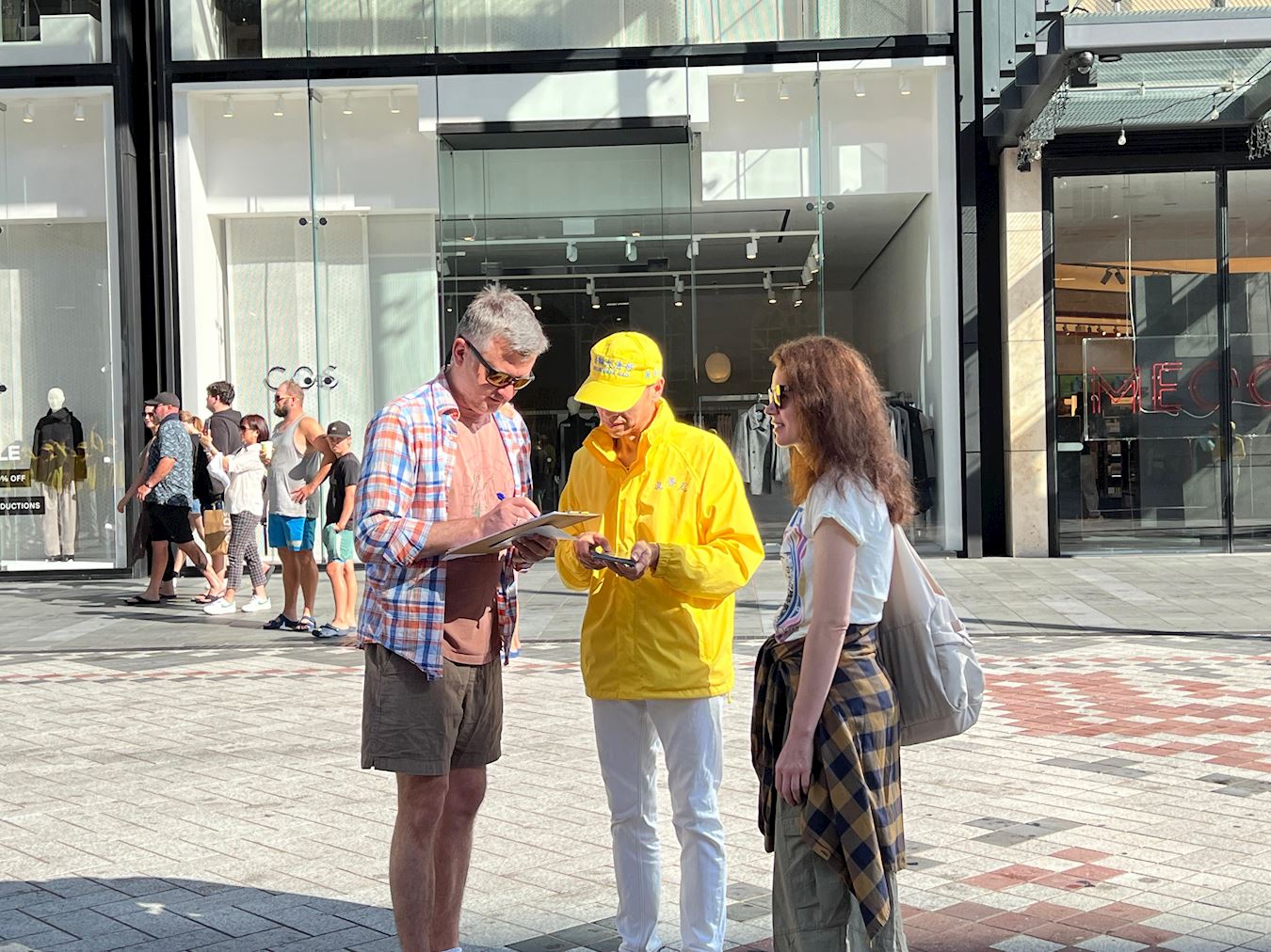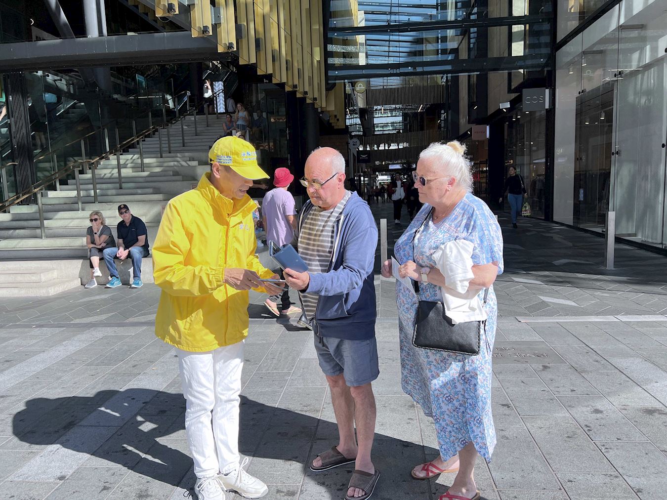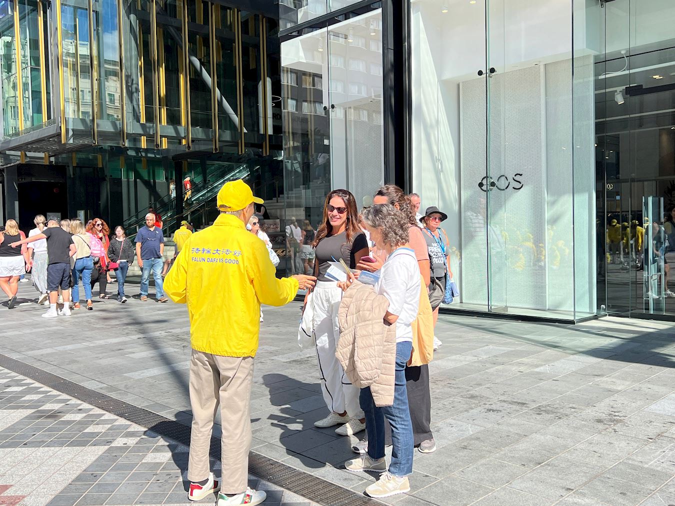Obučeni u žute majice i bijele pantalone, praktikanti su radili vježbe uz umirujuću muziku. Organizovan i miran prizor je naveo ljude da zastanu i posmatraju. U tom području se neprestano odvija pješački promet, a i ogromni se krstareći brod zaustavio u zaljevu. Turisti iz cijelog svijeta kao i lokalni kupci su se zaustavljali na informativnom štandu. Neki su čitali prikazane informacije dok su drugi fotografisali ili razgovarali sa praktikantima kako bi saznali više o Falun Dafa. Neki ljudi su pak na licu mjesta naučili vježbe.
