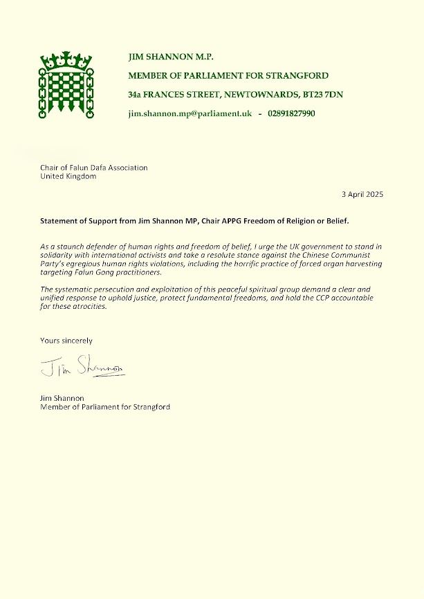 Poslanik Džim Šenon, predsedavajući APPG za slobodu veroispovesti ili uverenja, naveo je u svom pismu: „Kao nepokolebljivi branilac ljudskih prava i slobode verovanja, pozivam vladu Ujedinjenog Kraljevstva da se solidariše sa međunarodnim aktivistima i zauzme odlučan stav protiv eklatantne prakse kršenja ljudskih prava Komunističke partije Kine, uključujući užasnu praksu uzimanja organa na živo, čija su meta praktikanti Falun Gonga.”