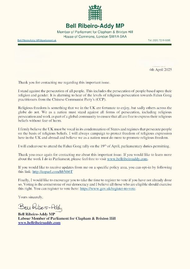 Poslanik Rt. Hon. Ričard Holden je u svom pismu naveo: „I dalje sam duboko zabrinut zbog tekućeg progona praktikanata Falun Gonga i drugih verskih i etničkih grupa od strane Komunističke partije Kine.”