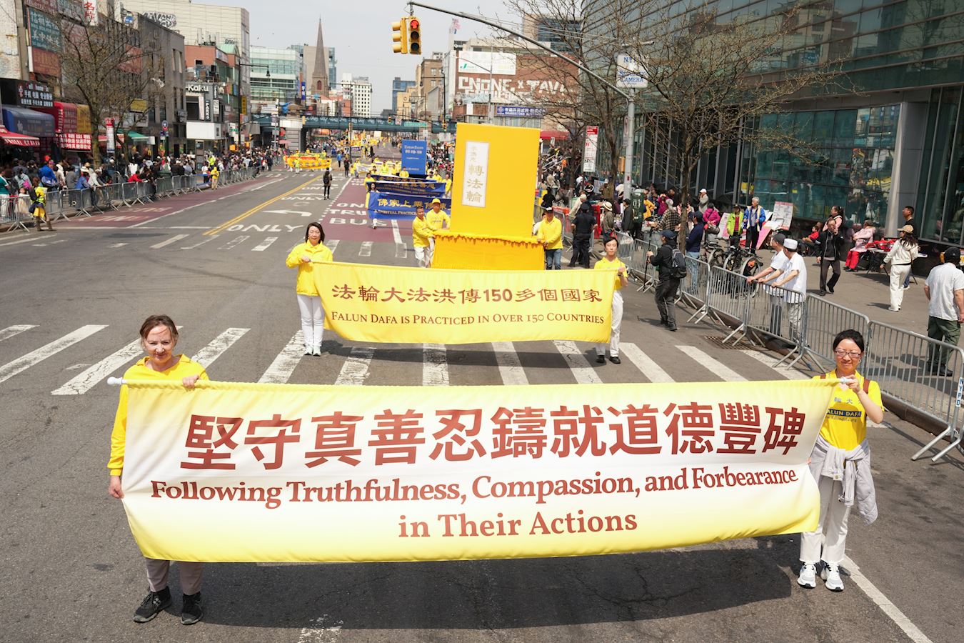 U 12 sati, sa Tian Guo Marching Bandom koji je preuzeo vodstvo, praktikanti su marširali glavnom ulicom, Flushing. Nastup benda je dirnuo gledaoce. Jedna osoba je uzviknula: "Samo jedna riječ, sjajno!" Drugi je rekao: "Falun Dafa je nevjerovatan!" Ostali komentari su bili: “Istinitost, Dobrodušnost i Tolerancija donose nadu!“ i "Ne mogu prestati plakati, toliko su dirljivi, osjećam se ponosno zbog njih. Morate pokazati svijetu progon koji se još uvijek dešava, i mora prestati." “Nada za Kinu leži u Falun Gong-u.”