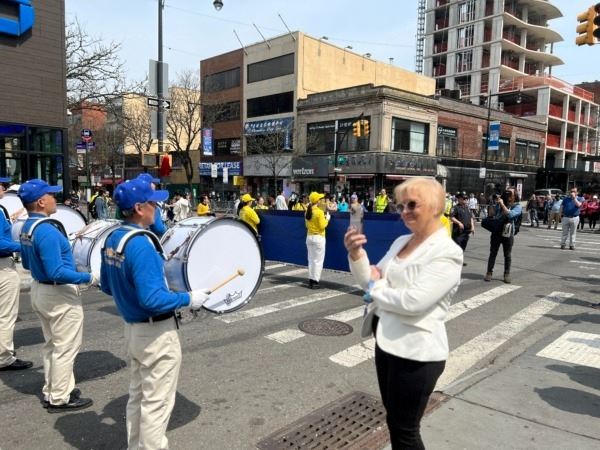 Ibetta Ponte, voditeljica ureda u pedijatrijskoj ordinaciji u Queensu, je stala i gledala paradu. Dok ju je snimala, obrisala je suze sa lica i rekla: "Tako sam ganuta, ne mogu da opišem kako se osjećam." Objasnila je da je duboko dirnuta čvrstom vjerom praktikanata: "Toliko su patili zbog odbrane svojih vjerskih uvjerenja, to je strašno. Duboko su me dirnuli."