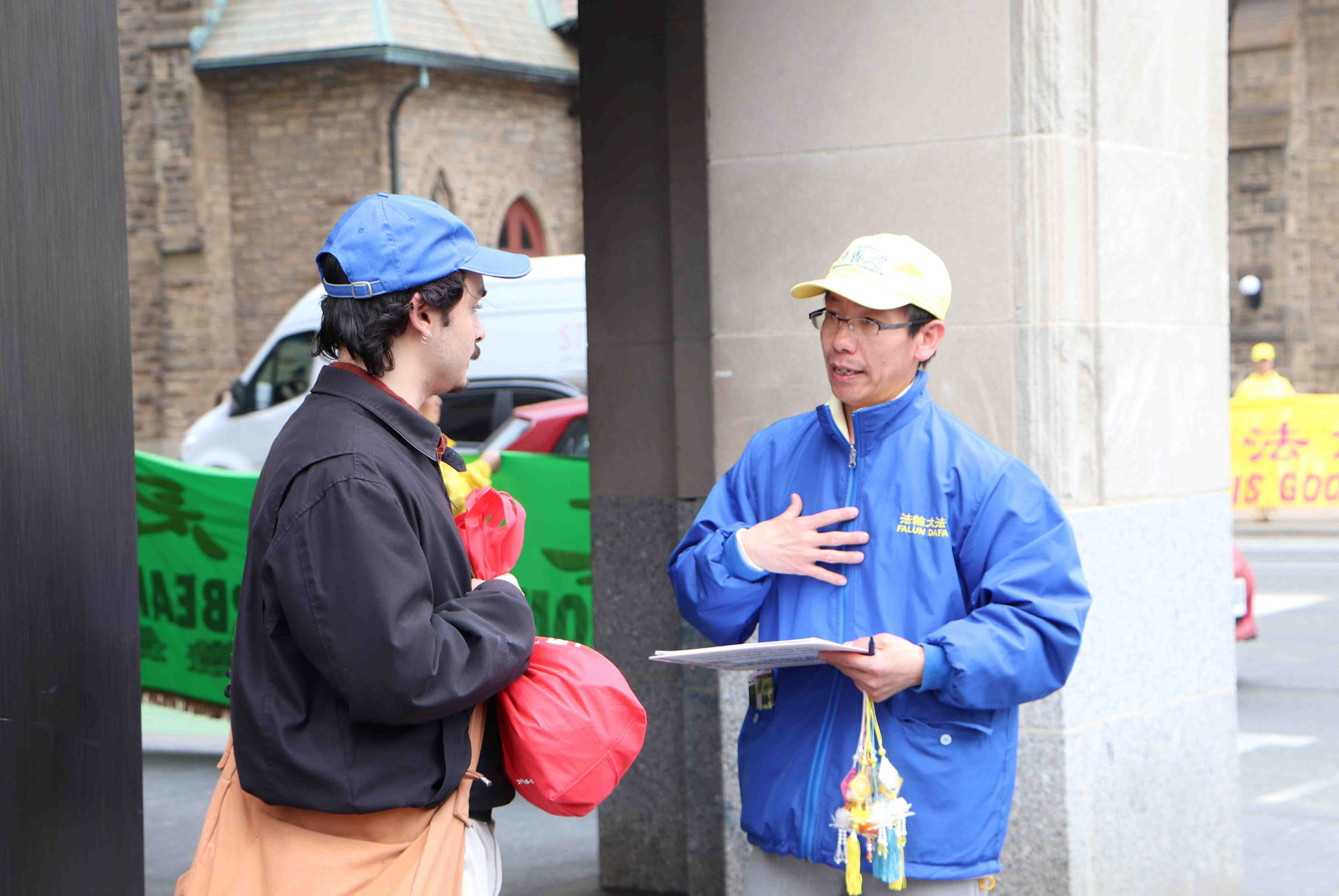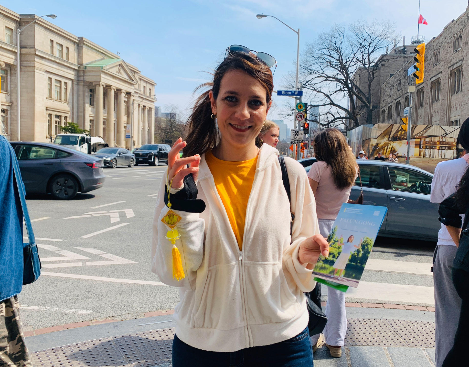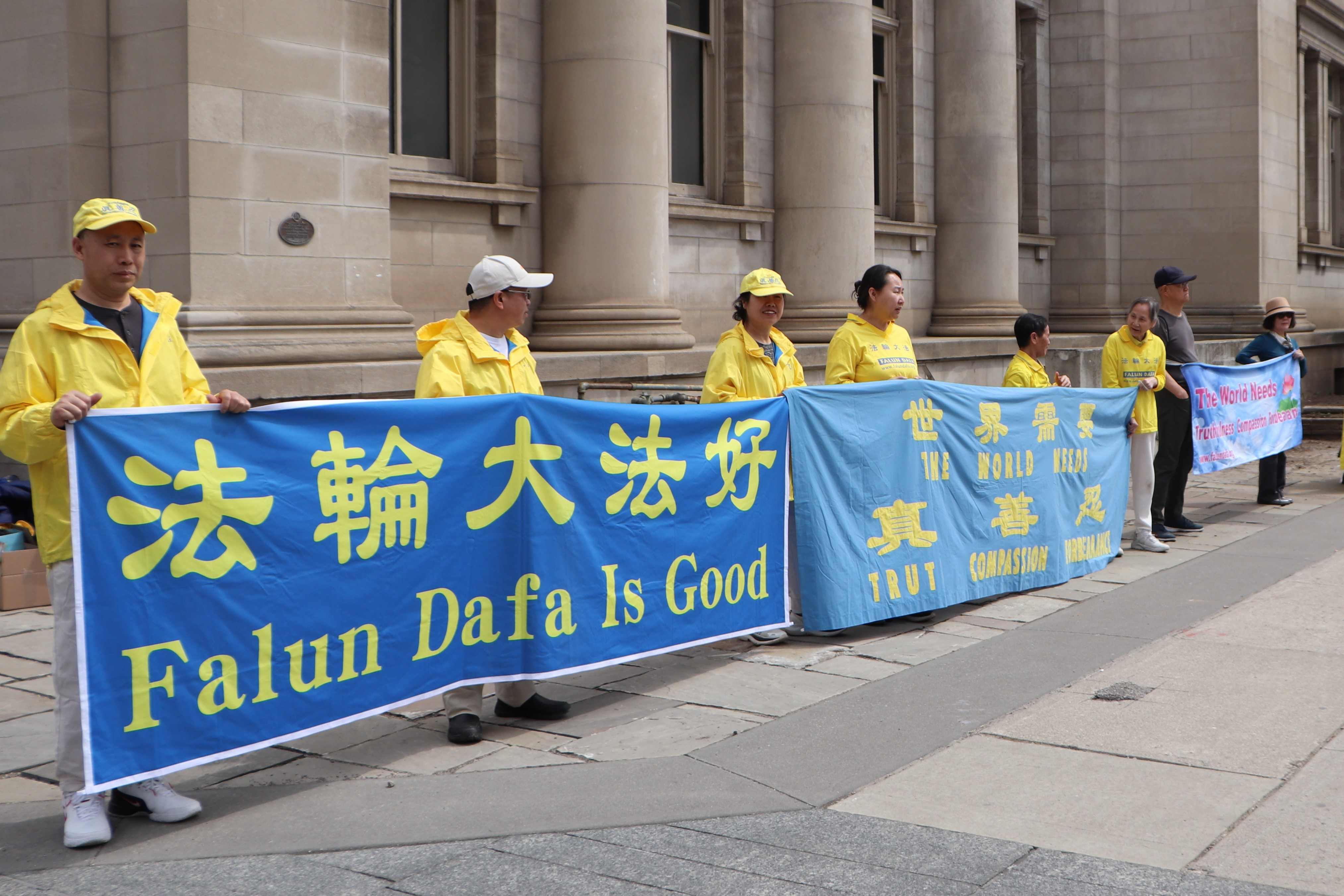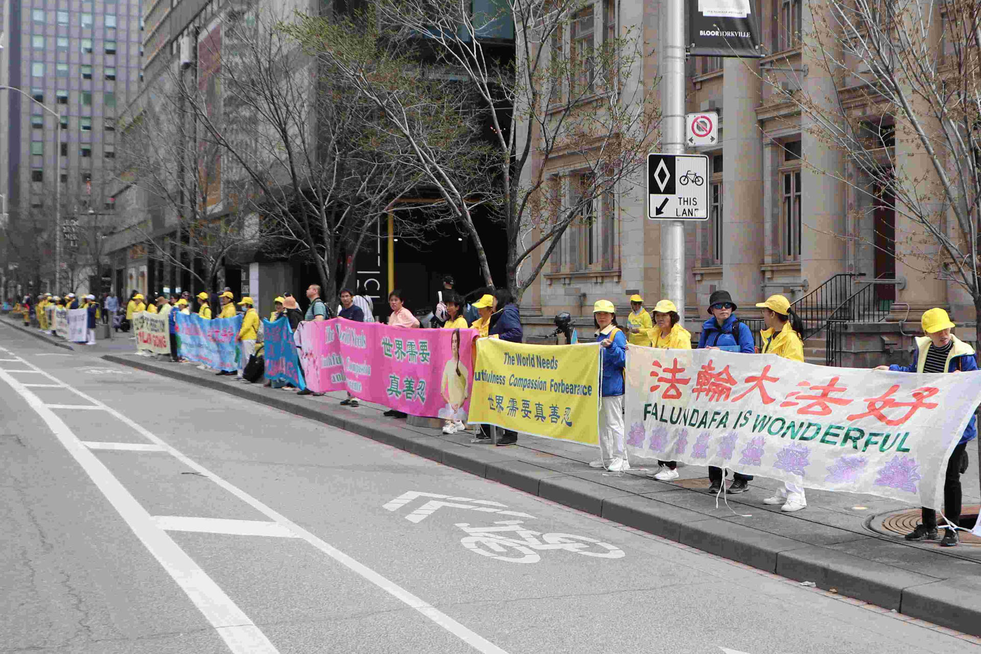 Tog popodneva, na raskrsnici Avenue Road i Bloor Street, postavili su transparente kako bi kod građana podigli svijest o tekućem progonu Falun Gonga u Kini. Prolaznici su potpisivali peticiju u znak podrške naporima praktikanata da okončaju progon i osudili KPK za zločine koje je počinila nad praktikantima. Nakon što su saznali istinu o progonu, nekoliko ljudi iz Kine je odlučilo napustiti KPK i njene pridružene organizacije.