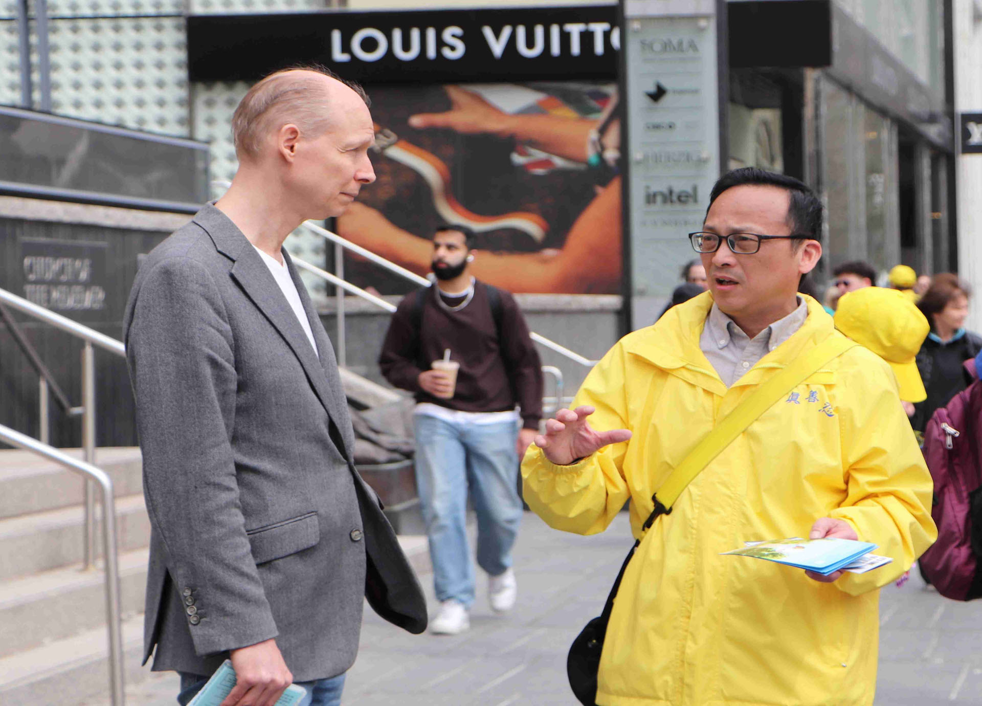 Jedan je čovjek iz Xinjianga razgovarao s praktikantima koji su držali transparente. Rekao je da je već ranije razgovarao sa praktikantima u tržnom centru Pacific i da je napustio mlade pionire i omladinsku ligu. Njegova je vjera islam, ali su pod vlašću KPK, njegova kultura i vjerovanje izbrisani.