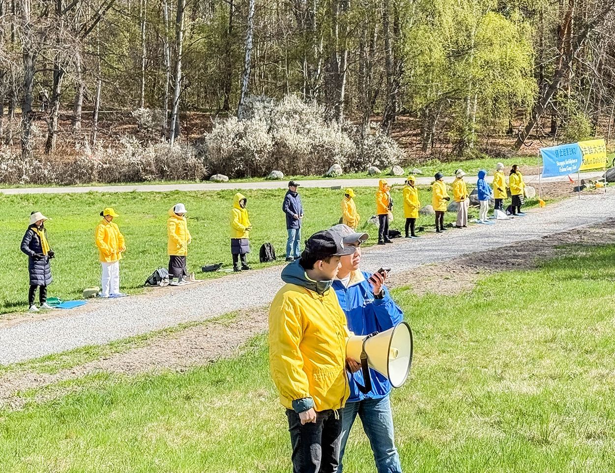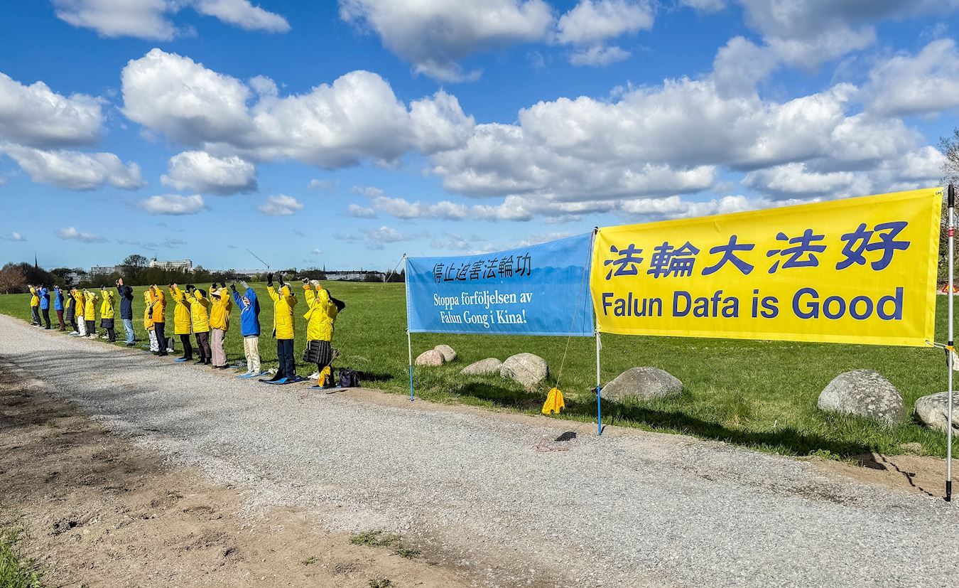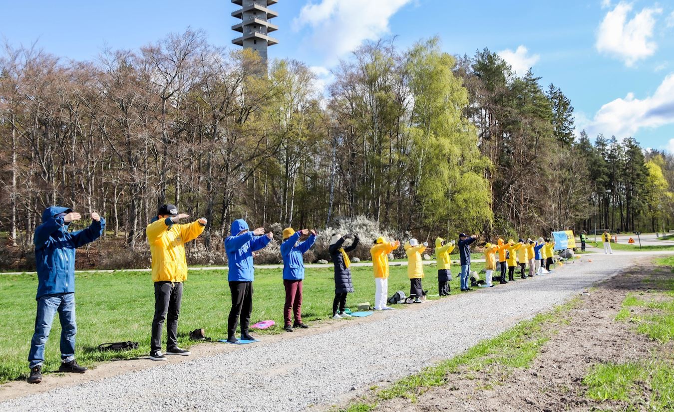 Praktikanti su 26. travnja 2025. mirno prosvjedovali ispred kineskog veleposlanstva u Stockholmu kako bi obilježili 26. godišnjicu apela od 25. travnja. Pozvali su švedsku vladu i javnost da pomognu u okončanju progona Falun Dafa (također poznatog kao Falun Gong) od strane Komunističke partije Kine (KPK).