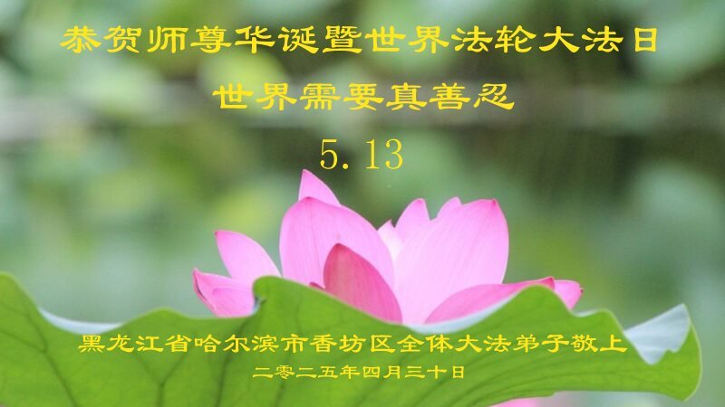 Praktikanti Falun Dafa iz Harbina žele poštovanom Učitelju sretan rođendan i slave Svjetski dan Falun Dafa!