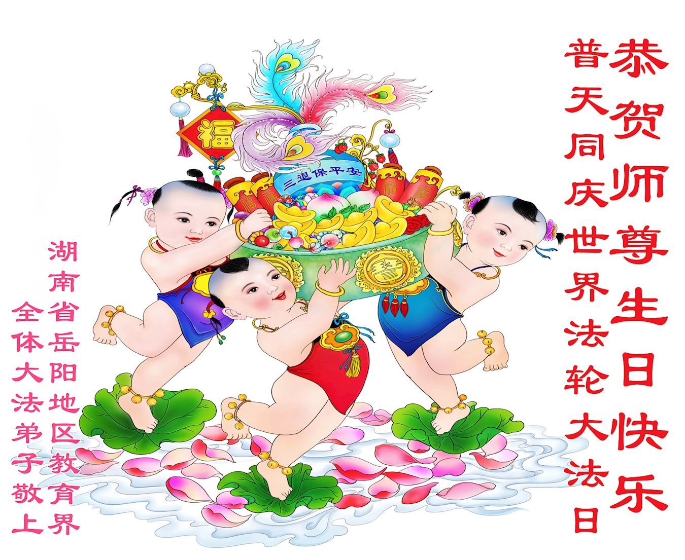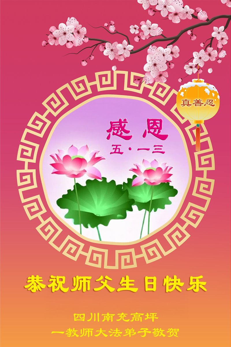 Izrazili su zahvalnost Učitelju Liju što im je predstavio Falun Dafu i što ih je vodio i štitio na njihovim putevima kultivacije. Poželeli su mu srećan rođendan i zavetovali se da će se čvrsto kultivisati i probuditi savest još ljudi da budu dostojni Učiteljevog mukotrpnog spasenja.
