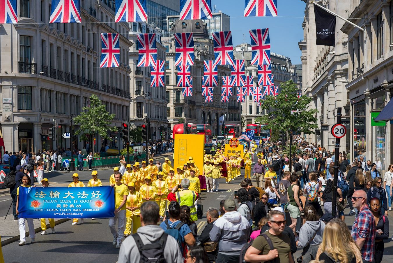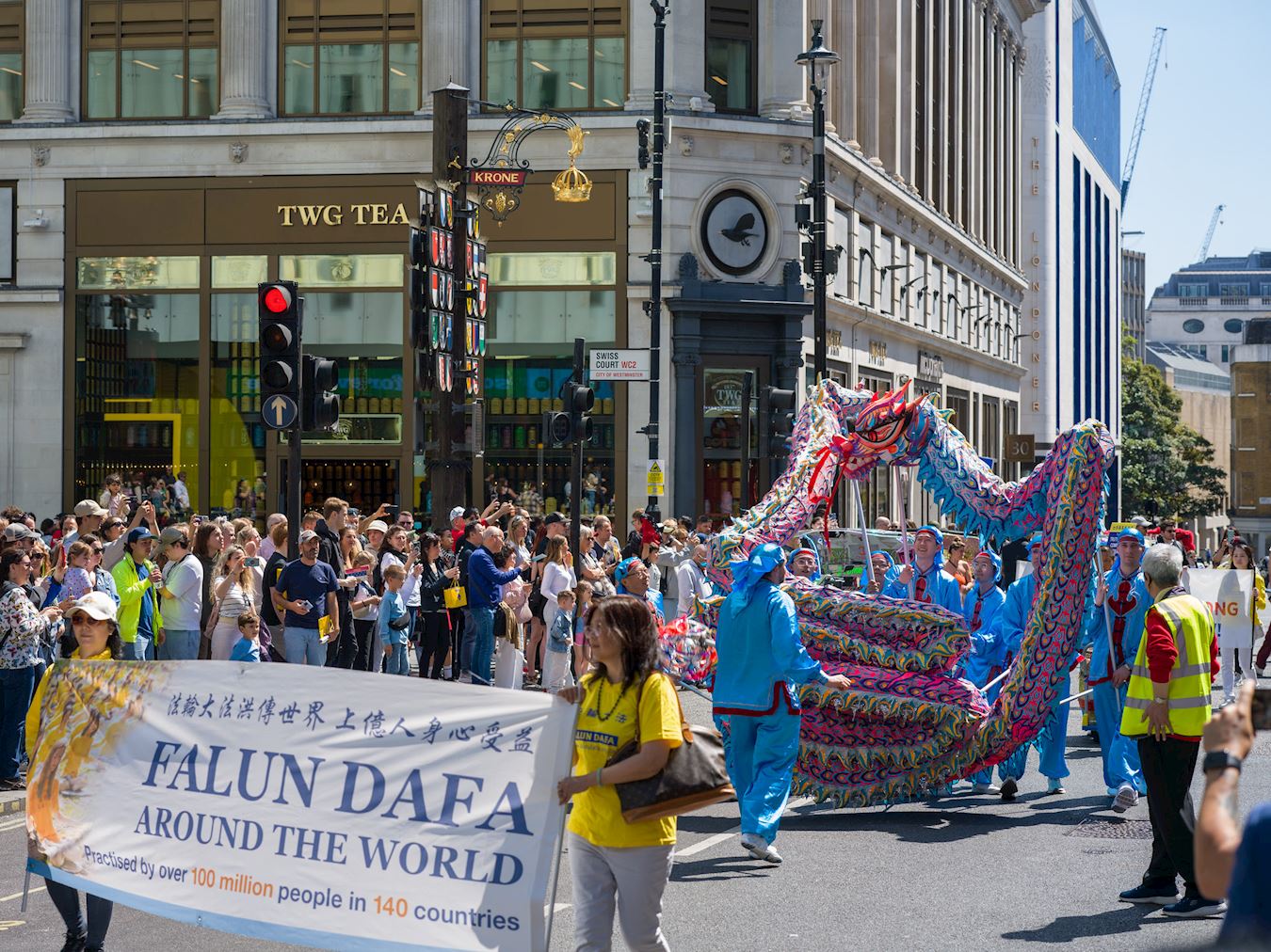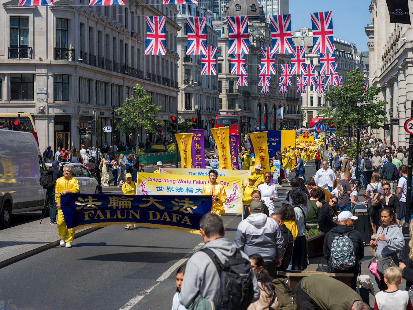 Praktikanti su 10. maja 2025. godine održali veliku paradu i skup u centru Londona kako bi proslavili 26. Svjetski dan Falun Dafa, koji se obilježava 13. maja. Ovaj dan je ujedno bio i 33. godišnjica javnog predstavljanja ove duhovne prakse i rođendan njenog osnivača, Učitelja Li Hongzhija.