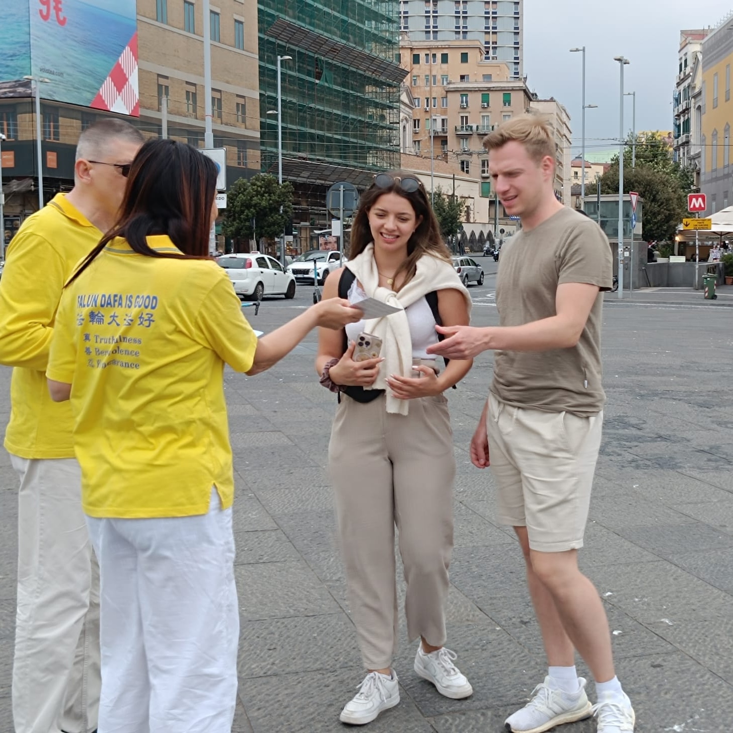 U čast Svetskog dana Falun Dafa i sa željom da čestitaju rođendan osnivaču, Učitelju Li Hongžiju, praktikanti Dafa iz celog Italija organizovali su grupne vežbe i aktivnosti ispred zgrade gradske uprave u Napulju 11. maja 2025. godine. Napulj je u južnom delu Italije, treći po veličini grad Italije i najgušće naseljeni grad u Evropi.