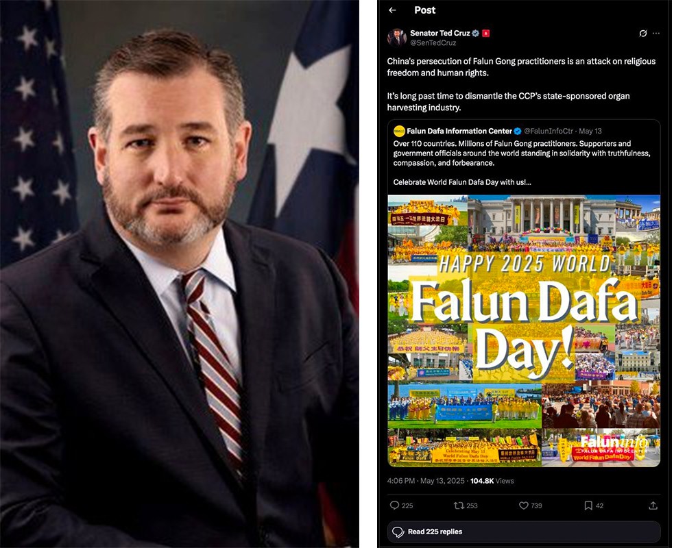 Senator Ted Cruz iz Teksasa je 13. maja na društvenim mrežama objavio informacije o proslavi Svjetskog Falun Dafa dana. Napisao je: „Progon praktikanata Falun Gonga od strane Kine je napad na vjerske slobode i ljudska prava. Krajnje je vrijeme da se demontira industrija žetve organa koju sponzorira KPK (Komunistička partija Kine) kao država.“