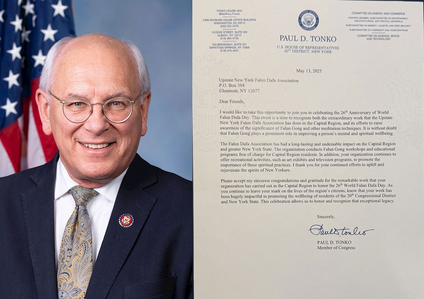 Zastupnik Paul D. Tonko u svom je pismu izjavio: „Želio bih iskoristiti ovu priliku da vam se pridružim u proslavi 26. godišnjice Svjetskog Falun Dafa dana. Ovaj događaj je prilika da se oda priznanje izvanrednom radu koji je Falun Dafa Udruženje sjevernog dijela države New York učinilo u regiji glavnog grada, kao i njegovim naporima da podižu svijest o značaju Falun Gonga i drugih tehnika meditacije. Nema sumnje da Falun Gong igra istaknutu ulogu u poboljšanju mentalnog i duhovnog blagostanja pojedinca.”