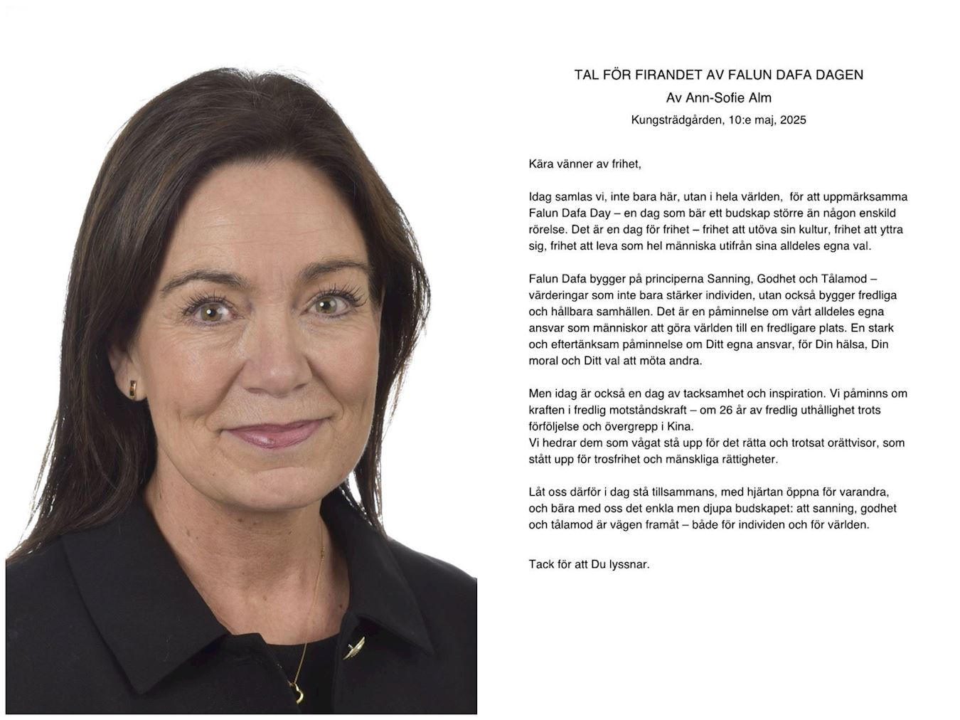 Poslanica An-Sofi Alm je napisala: „Danas se okupljamo, ne samo ovde, već širom sveta, da obeležimo Dan Falun Dafe, dan koji nosi poruku veću od bilo kog pojedinačnog pokreta. To je dan slobode, slobode praktikovanja svoje kulture, slobode izražavanja, slobode da se živi kao celovita ličnost na osnovu sopstvenih izbora.